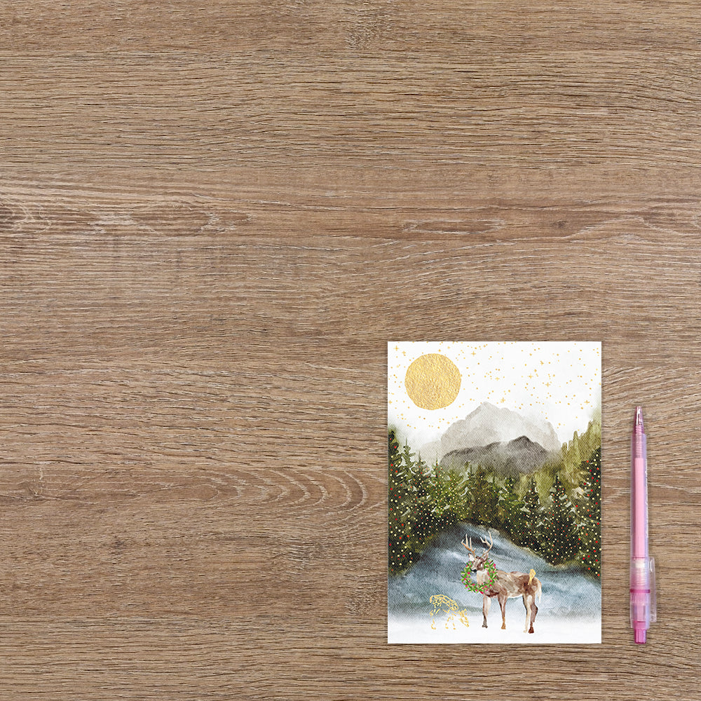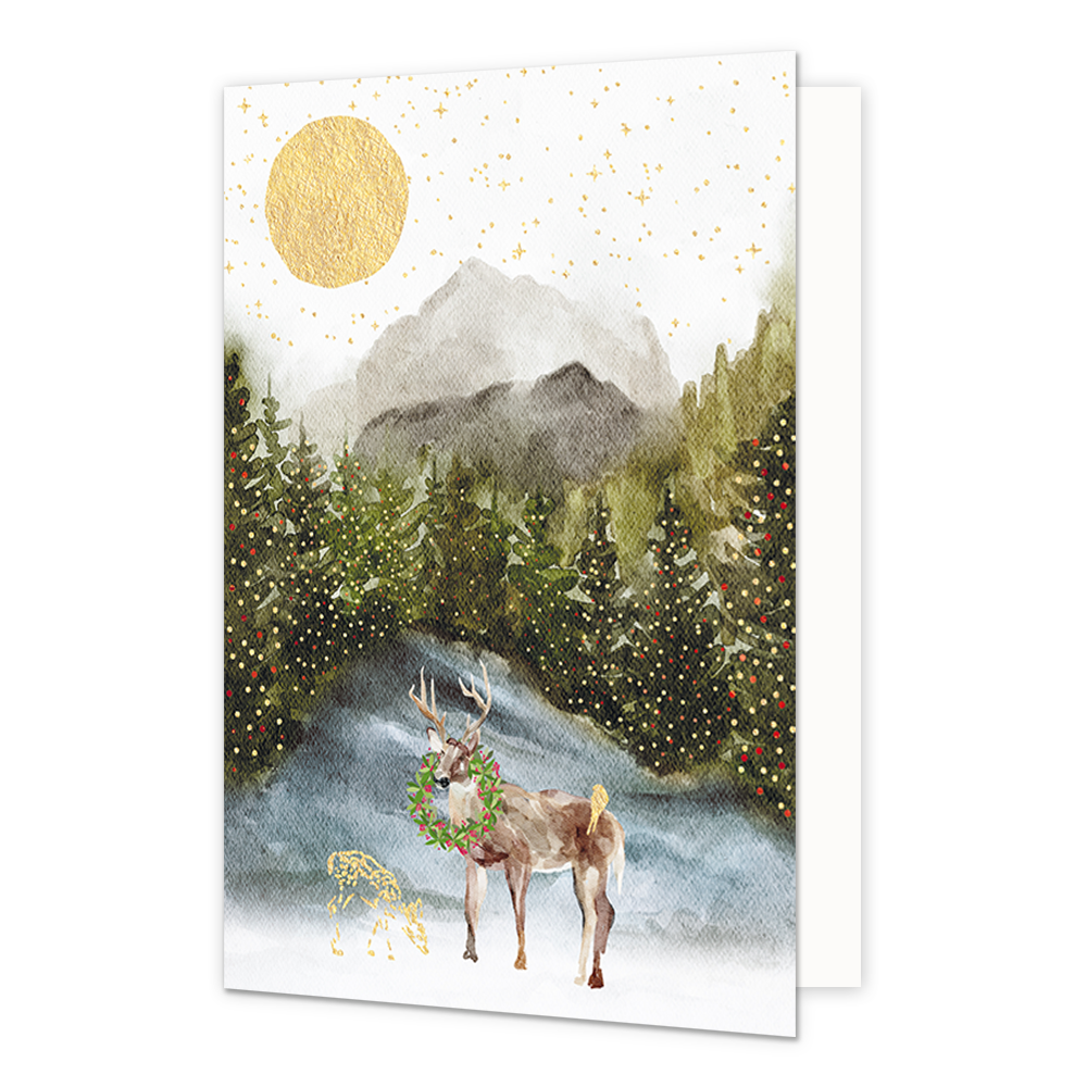 De wenskaart heeft een afmeting van x en een staande vorm. Op deze kerstkaart staat een boslandschap met twee rendieren in de sneeuw. De binnenzijde van de wenskaart is blanco wat voldoende ruimte geeft om een persoonlijke boodschap te schrijven .