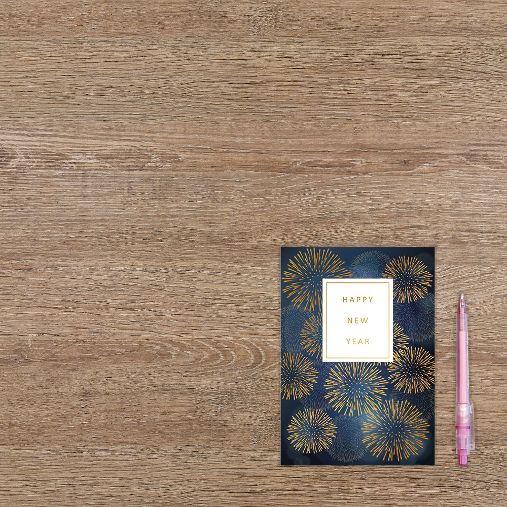 De wenskaart heeft een afmeting van x en een staande vorm. Op deze kerstkaart staat gouden vuurwerk met in het midden de tekst: "Happy new year". De binnenzijde van de wenskaart is blanco wat voldoende ruimte geeft om een persoonlijke boodschap te schrijven .