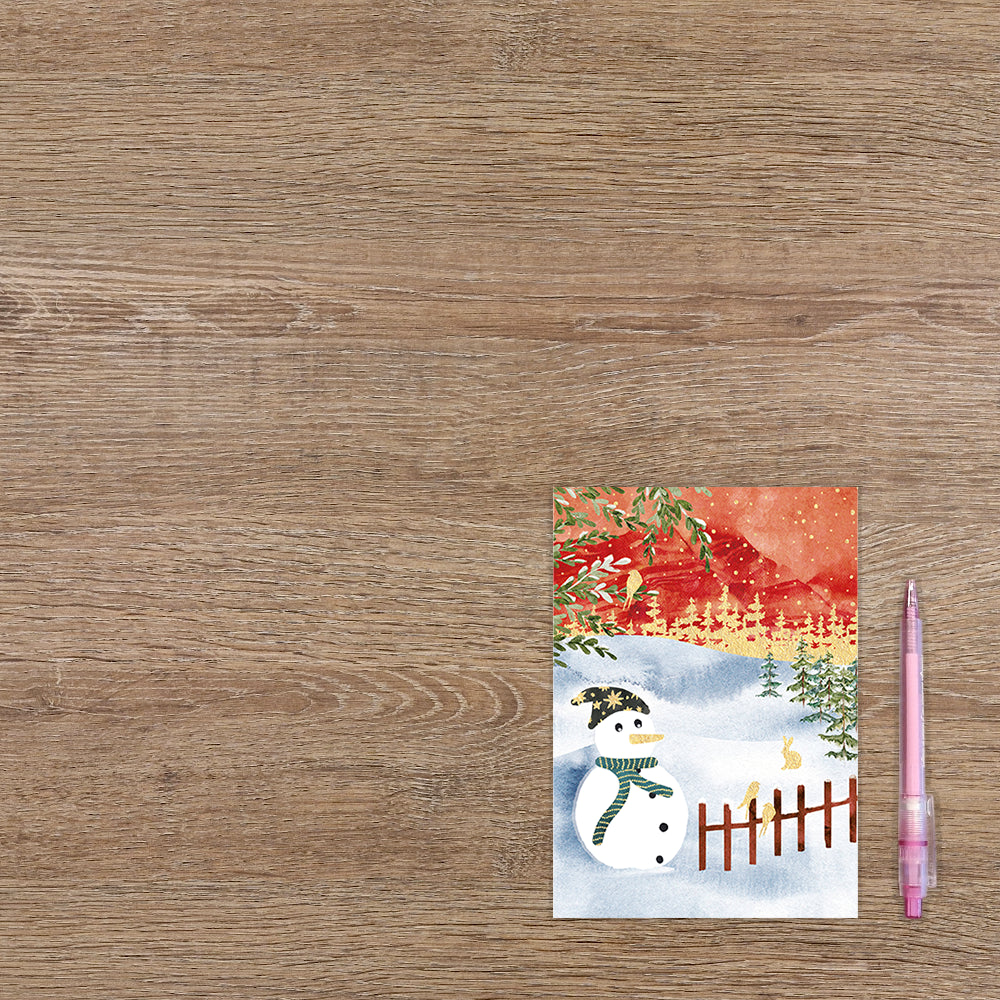 De wenskaart heeft een afmeting van x en een staande vorm. Op deze kerstkaart staat een sneeuwlandschap met een sneeuwpop. De binnenzijde van de wenskaart is blanco wat voldoende ruimte geeft om een persoonlijke boodschap te schrijven .