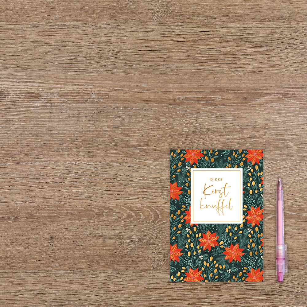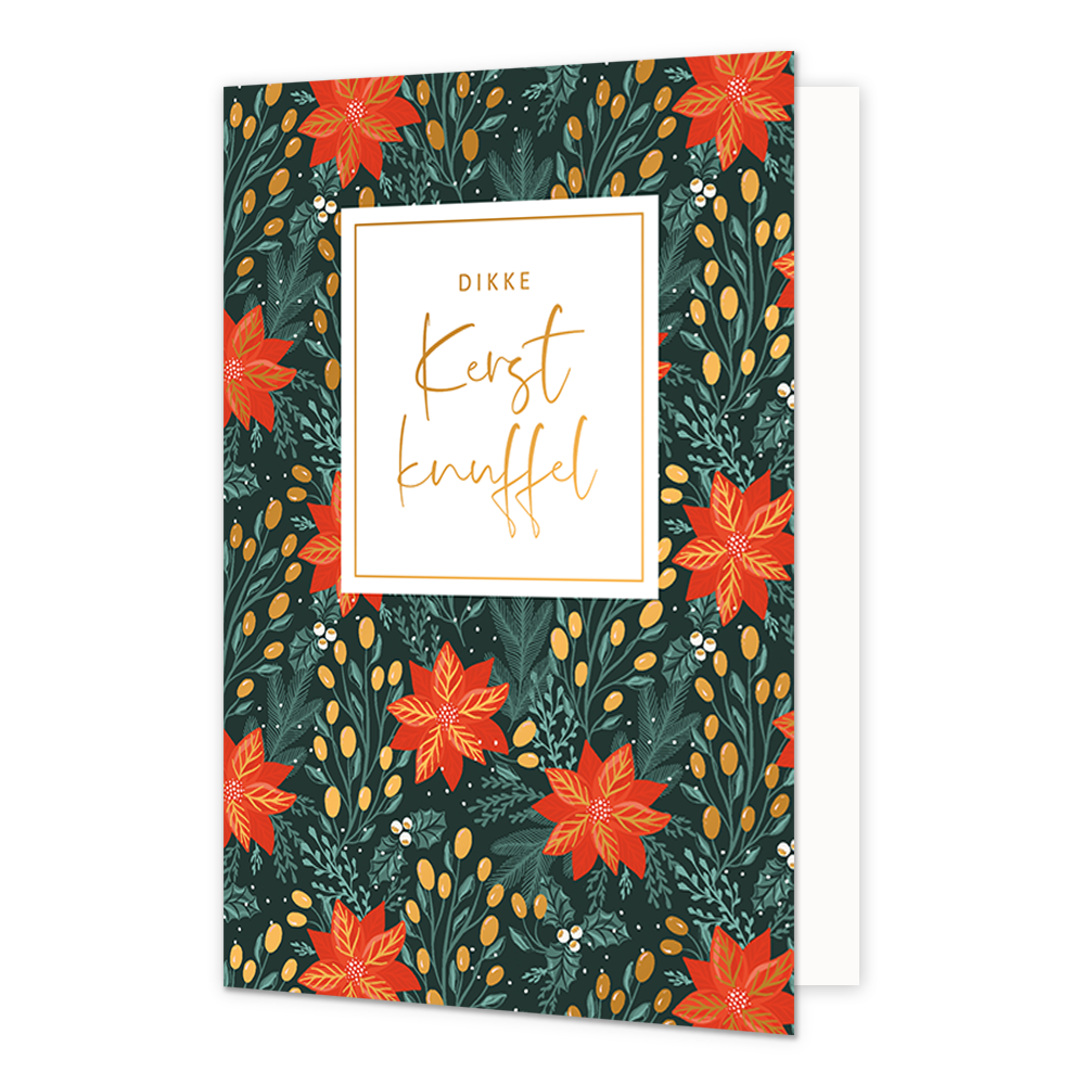 De wenskaart heeft een afmeting van x en een staande vorm. Op deze kerstkaart staan oranje bloemen met gouden knopjes en groene blaadjes. In het midden staat de tekst: "Dikke kerst knuffel". De binnenzijde van de wenskaart is blanco wat voldoende ruimte geeft om een persoonlijke boodschap te schrijven .