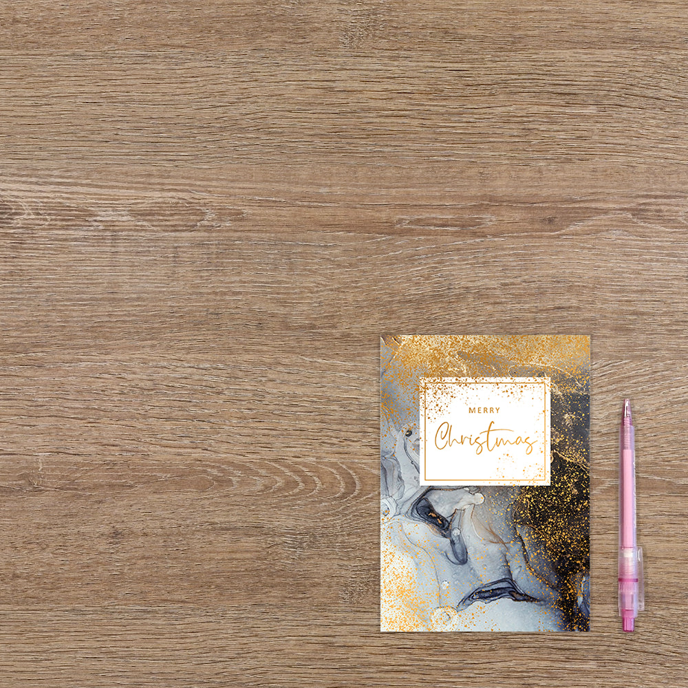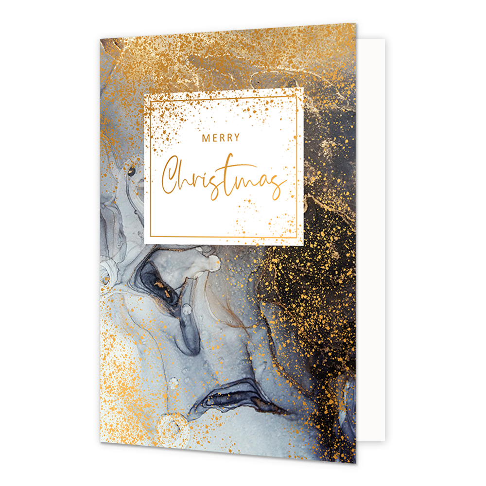 De wenskaart heeft een afmeting van x en een staande vorm. Op deze artistieke kerstkaart staat een ontwerp in de kleuren grijs, zwart, wit en goud, met in het midden de tekst: "Merry christmas". De binnenzijde van de wenskaart is blanco wat voldoende ruimte geeft om een persoonlijke boodschap te schrijven .