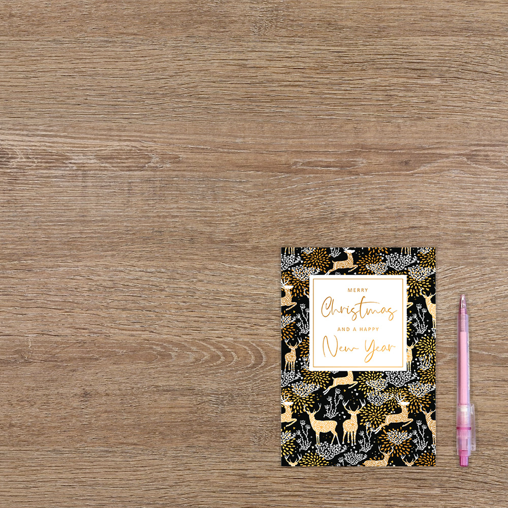 De wenskaart heeft een afmeting van x en een staande vorm. Op deze kerstkaart staan rendieren en takken met in het midden de tekst: "Merry christmas and a happy new year". De binnenzijde van de wenskaart is blanco wat voldoende ruimte geeft om een persoonlijke boodschap te schrijven .