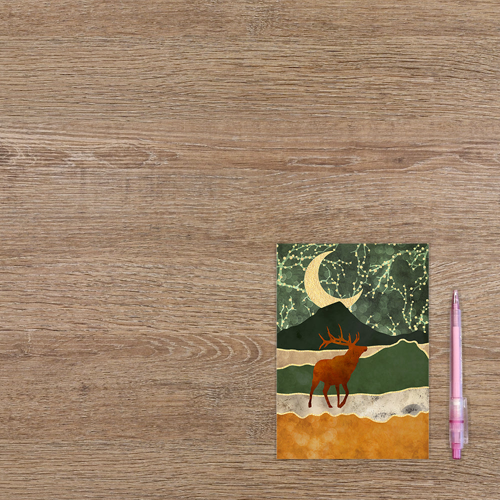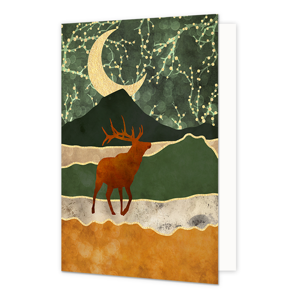 De wenskaart heeft een afmeting van x en een staande vorm. Op deze kerstkaart staat een rendier dat door een landschap loopt met een halve maan. De binnenzijde van de wenskaart is blanco wat voldoende ruimte geeft om een persoonlijke boodschap te schrijven .