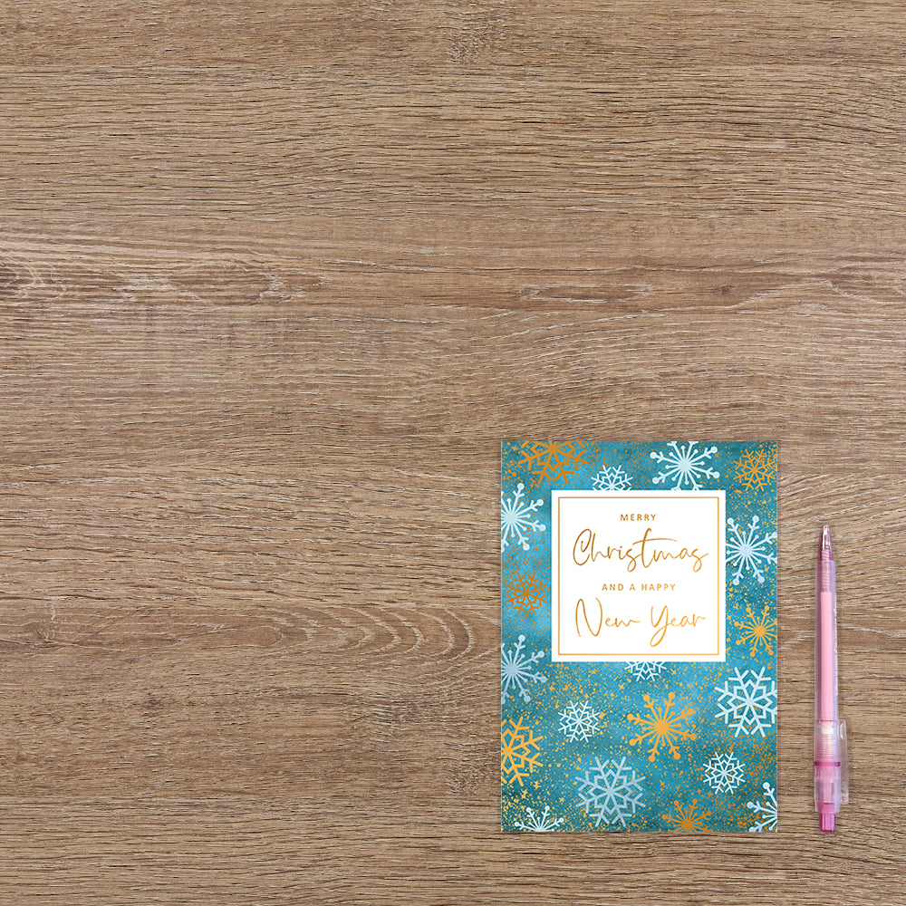 De wenskaart heeft een afmeting van x en een staande vorm. Op deze kerstkaart staan sneeuwvlokjes in de kleuren wit en goud met in het midden de tekst: "Merry christmas and a happy new year". De binnenzijde van de wenskaart is blanco wat voldoende ruimte geeft om een persoonlijke boodschap te schrijven .