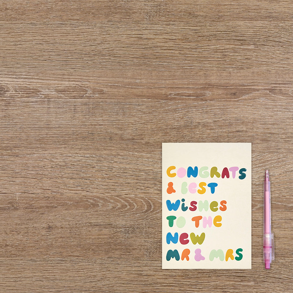 De wenskaart heeft een afmeting van x en een staande vorm. Op deze wenskaart staat de tekst: "Congrats & best wishes to the new mr & mrs". De binnenzijde van de wenskaart is blanco wat voldoende ruimte geeft om een persoonlijke boodschap te schrijven .