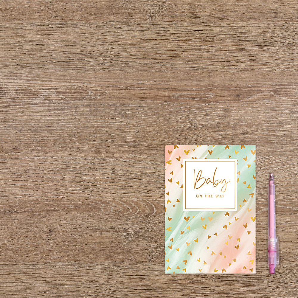 De wenskaart heeft een afmeting van x en een staande vorm. Op deze artistieke wenskaart is een ontwerp te zien met de kleuren roze, beige en groen, waar kleine gouden hartjes op zitten. In het midden zit een wit blok met de gouden tekst "Baby on the way". De binnenzijde van de wenskaart is blanco wat voldoende ruimte geeft om een persoonlijke boodschap te schrijven .