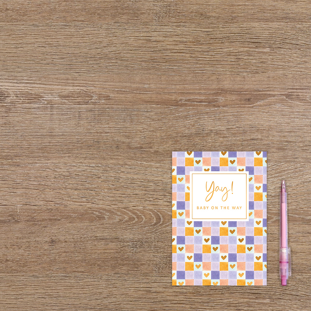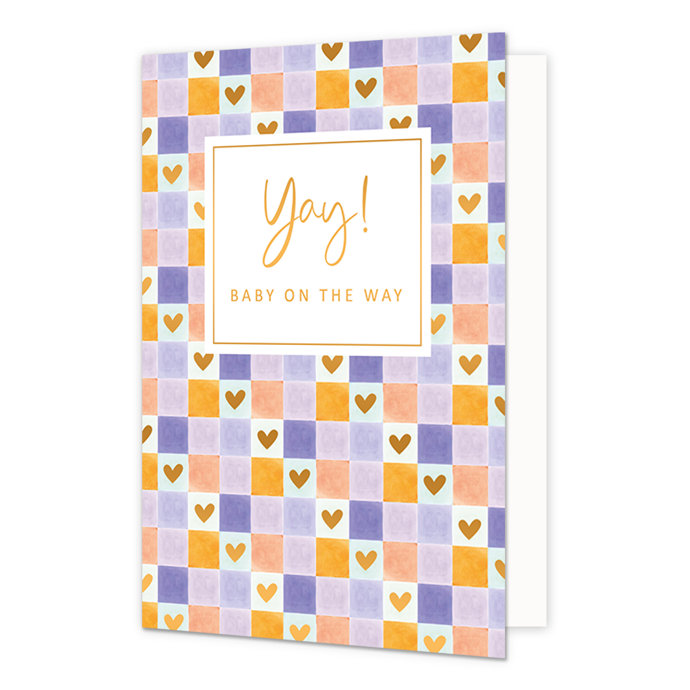 De wenskaart heeft een afmeting van x en een staande vorm. Op deze wenskaart zijn vakjes te zien met de kleuren goud, paars, lila en wit. In de witte vakjes zitten gouden hartjes. In het midden zit een wit blok met de gouden tekst "Yay! Baby on the way". De binnenzijde van de wenskaart is blanco wat voldoende ruimte geeft om een persoonlijke boodschap te schrijven .