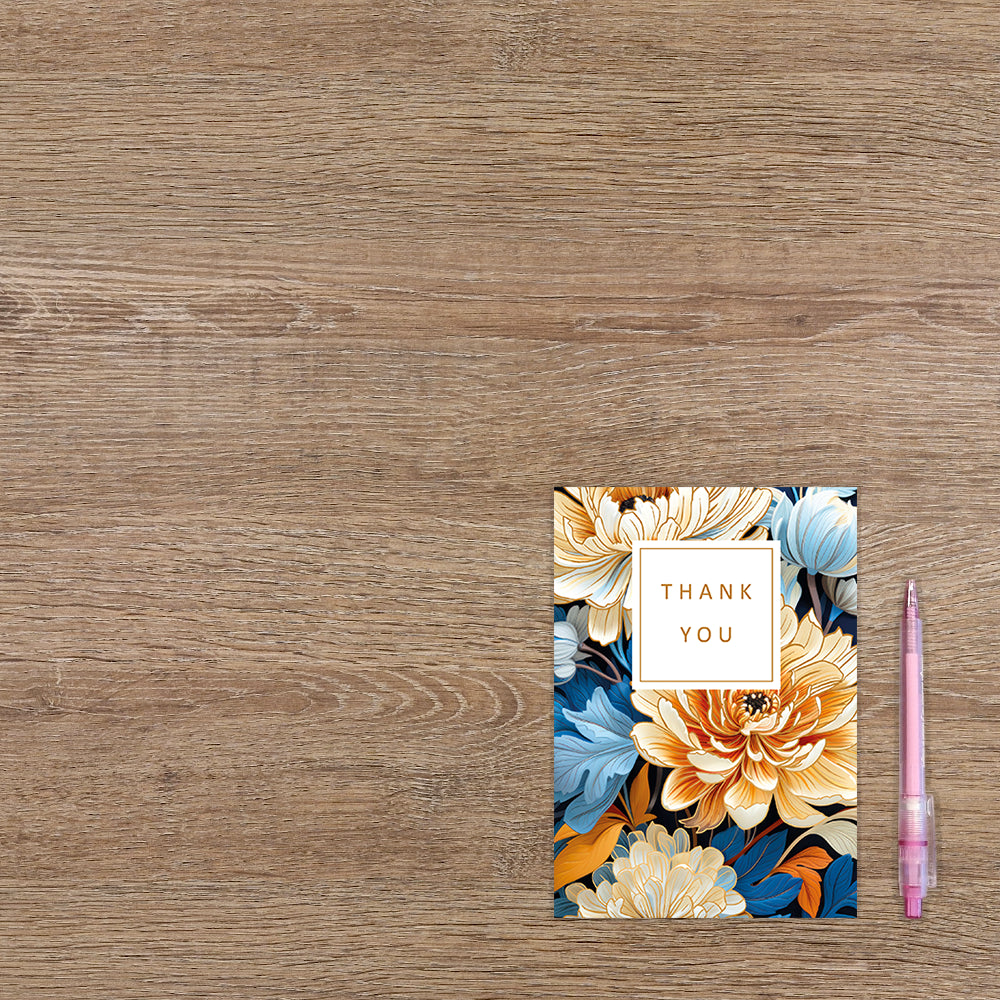 De wenskaart heeft een afmeting van x en een staande vorm. Op deze wenskaart zijn geel/oranje bloemen te zien met blauwe en oranje bladeren. In het midden zit een wit blok met de gouden tekst: "Thank you". De binnenzijde van de wenskaart is blanco wat voldoende ruimte geeft om een persoonlijke boodschap te schrijven .