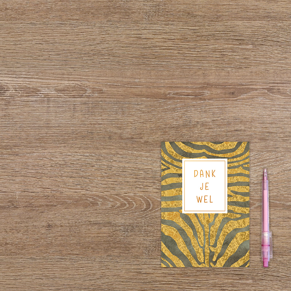 De wenskaart heeft een afmeting van x en een staande vorm. Op deze wenskaart zijn goud en zwarte strepen te zien. In het midden zit een wit blok met de gouden tekst: "Dank je wel". De binnenzijde van de wenskaart is blanco wat voldoende ruimte geeft om een persoonlijke boodschap te schrijven .