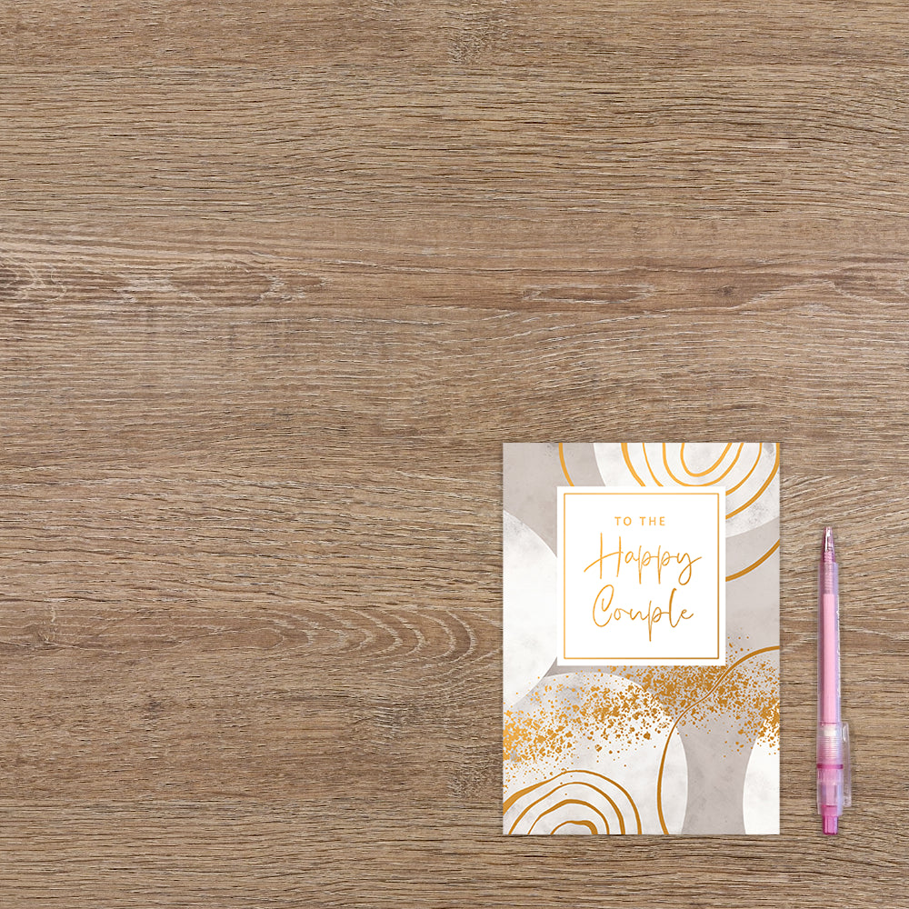De wenskaart heeft een afmeting van x en een staande vorm. Op deze artistieke wenskaart is een ontwerp te zien met gouden en witte cirkels op een grijze achtergrond. In het midden zit een wit blok met de gouden tekst: "To the happy couple". De binnenzijde van de wenskaart is blanco wat voldoende ruimte geeft om een persoonlijke boodschap te schrijven .