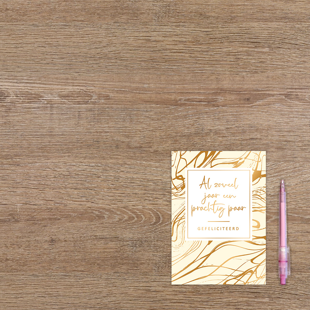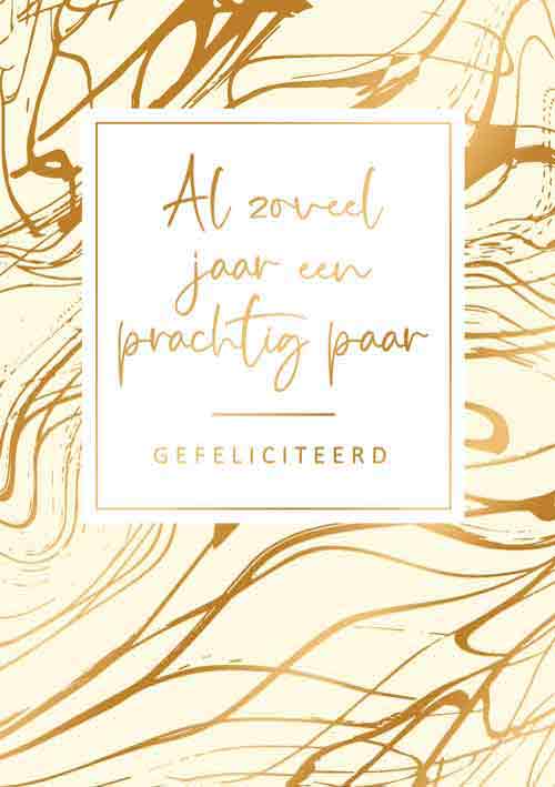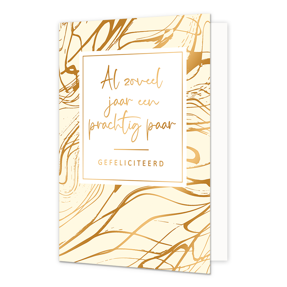 De wenskaart heeft een afmeting van x en een staande vorm. Op deze artistieke wenskaart zijn gouden lijnen te zien op een beige achtergrond. In het midden zit een wit blok met de gouden tekst: "Al zoveel jaar een prachtig paar gefeliciteerd". De binnenzijde van de wenskaart is blanco wat voldoende ruimte geeft om een persoonlijke boodschap te schrijven .