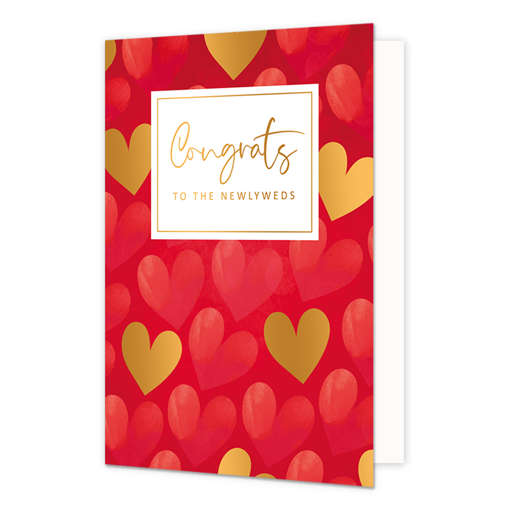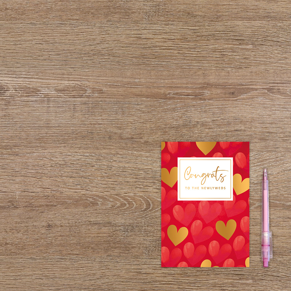 De wenskaart heeft een afmeting van x en een staande vorm. Op deze wenskaart zijn rode en gouden hartjes te zien op een rode achtergrond. In het midden zit een wit blok met de gouden tekst: "Congrats to the newlyweds". De binnenzijde van de wenskaart is blanco wat voldoende ruimte geeft om een persoonlijke boodschap te schrijven .