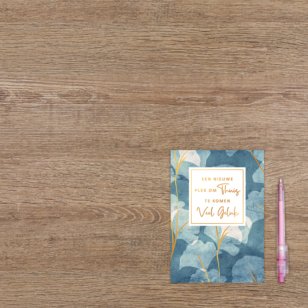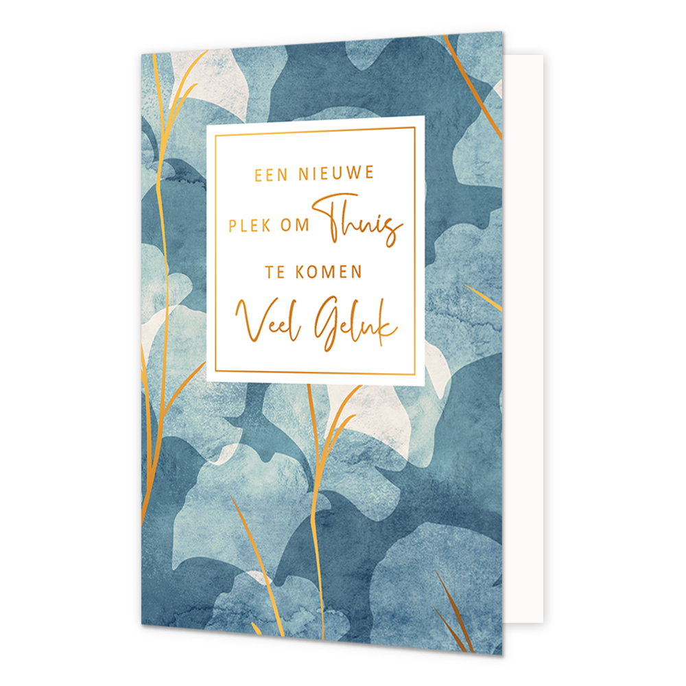 De wenskaart heeft een afmeting van x en een staande vorm. Op deze wenskaart zijn lichtblauwe bloemen te zien met gouden stelen, op een donkerblauwe achtergrond. In het midden zit een wit blok met de gouden tekst: "Een nieuwe plek om thuis te komen Veel Geluk". De binnenzijde van de wenskaart is blanco wat voldoende ruimte geeft om een persoonlijke boodschap te schrijven .