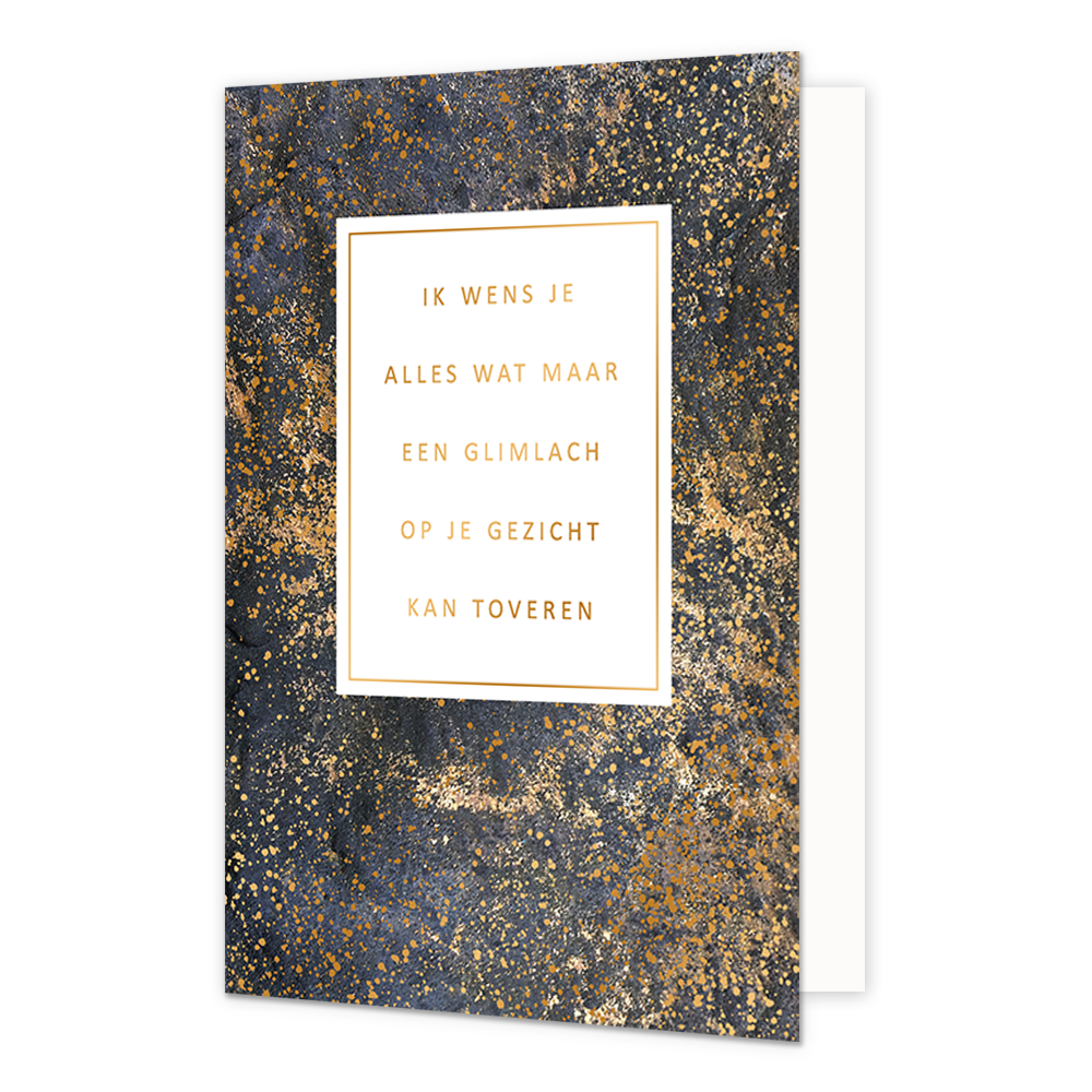 De wenskaart heeft een afmeting van x en een staande vorm. Op deze artistieke wenskaart staat een ontwerp met gouden spikkels op een zwarte achtergrond. In het midden zit een wit blok met de gouden tekst: "Ik wens je alles wat maar een glimlach op je gezicht kan toveren". De binnenzijde van de wenskaart is blanco wat voldoende ruimte geeft om een persoonlijke boodschap te schrijven .
