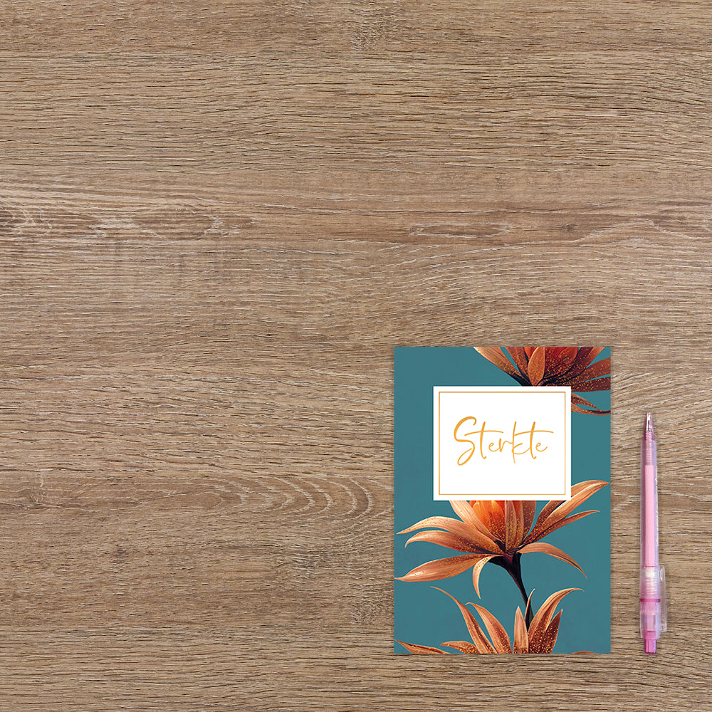 De wenskaart heeft een afmeting van x en een staande vorm. Op deze wenskaart is een oranje met goud kleurige bloem te zien op een blauwe achtergrond. In het midden zit een wit blok met de gouden tekst: "Sterkte". De binnenzijde van de wenskaart is blanco wat voldoende ruimte geeft om een persoonlijke boodschap te schrijven .