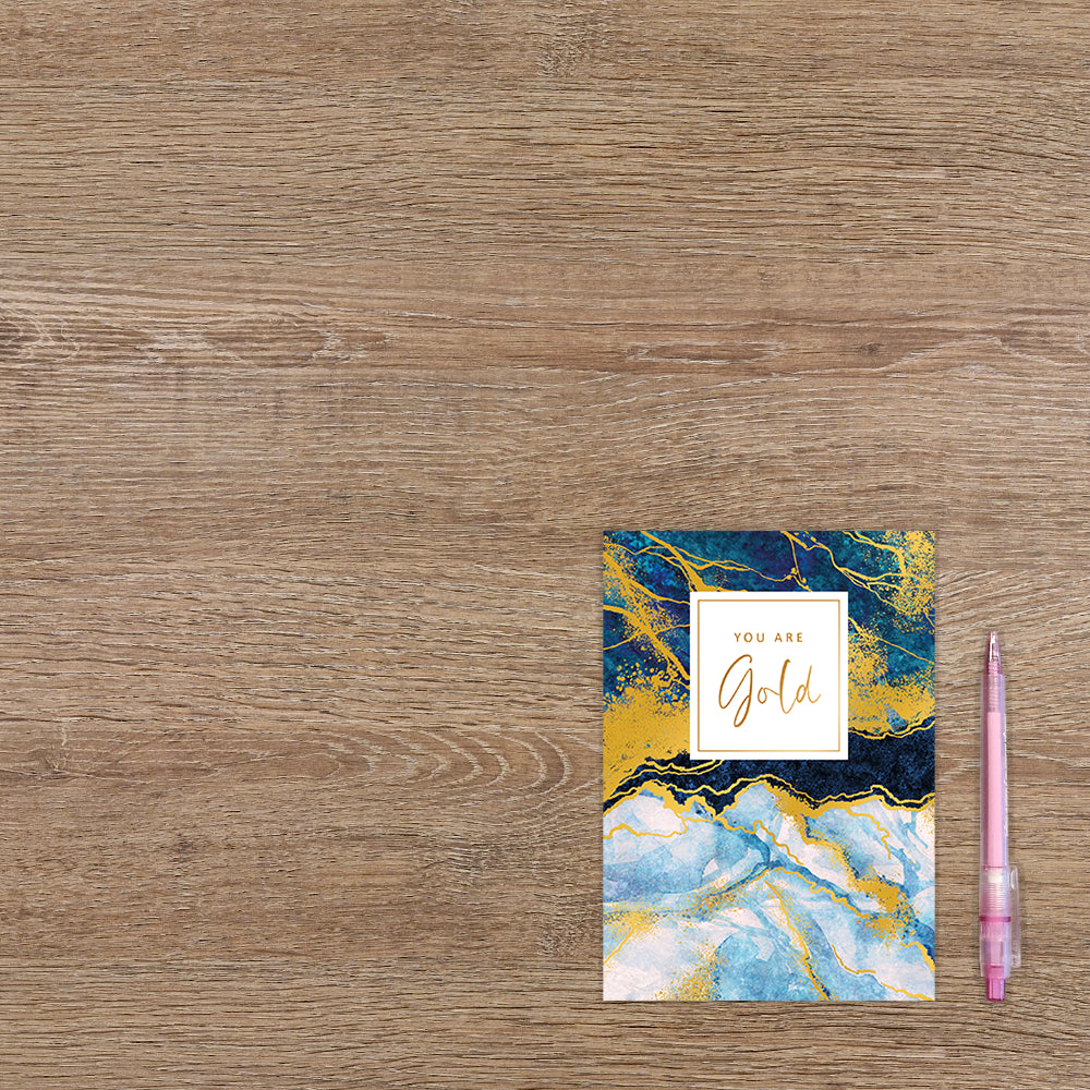 De wenskaart heeft een afmeting van x en een staande vorm. Op deze artistieke wenskaart is een ontwerp te zien met de kleuren wit, blauw, goud en zwart. In het midden zit een wit blok met de gouden tekst: "You are gold". De binnenzijde van de wenskaart is blanco wat voldoende ruimte geeft om een persoonlijke boodschap te schrijven .