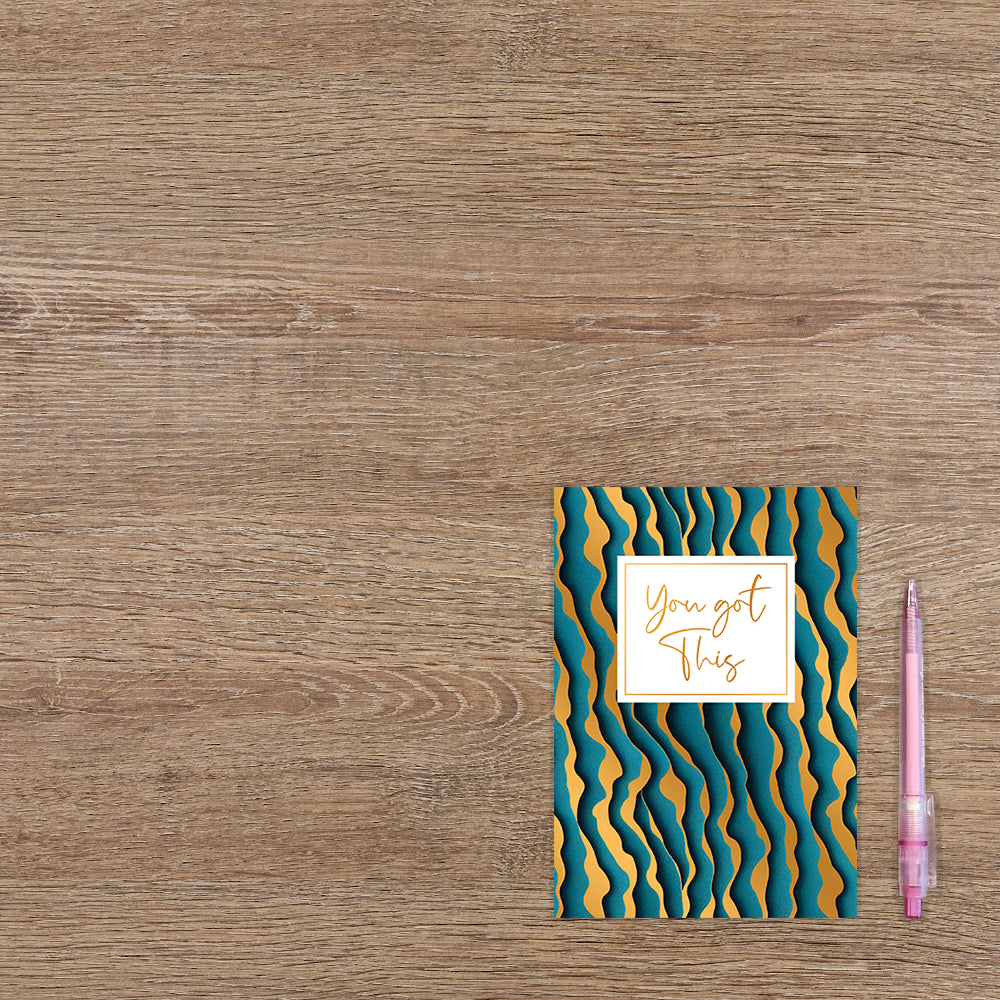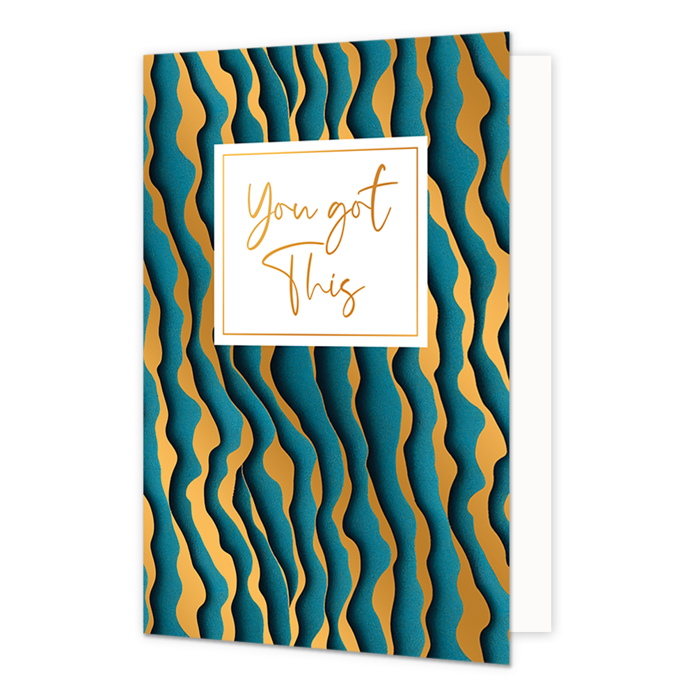 De wenskaart heeft een afmeting van x en een staande vorm. Op deze wenskaart zijn kronkelende lijnen te zien in de kleuren zwart, blauw en goud. In het midden zit een wit blok met de gouden tekst: "You got this". De binnenzijde van de wenskaart is blanco wat voldoende ruimte geeft om een persoonlijke boodschap te schrijven .