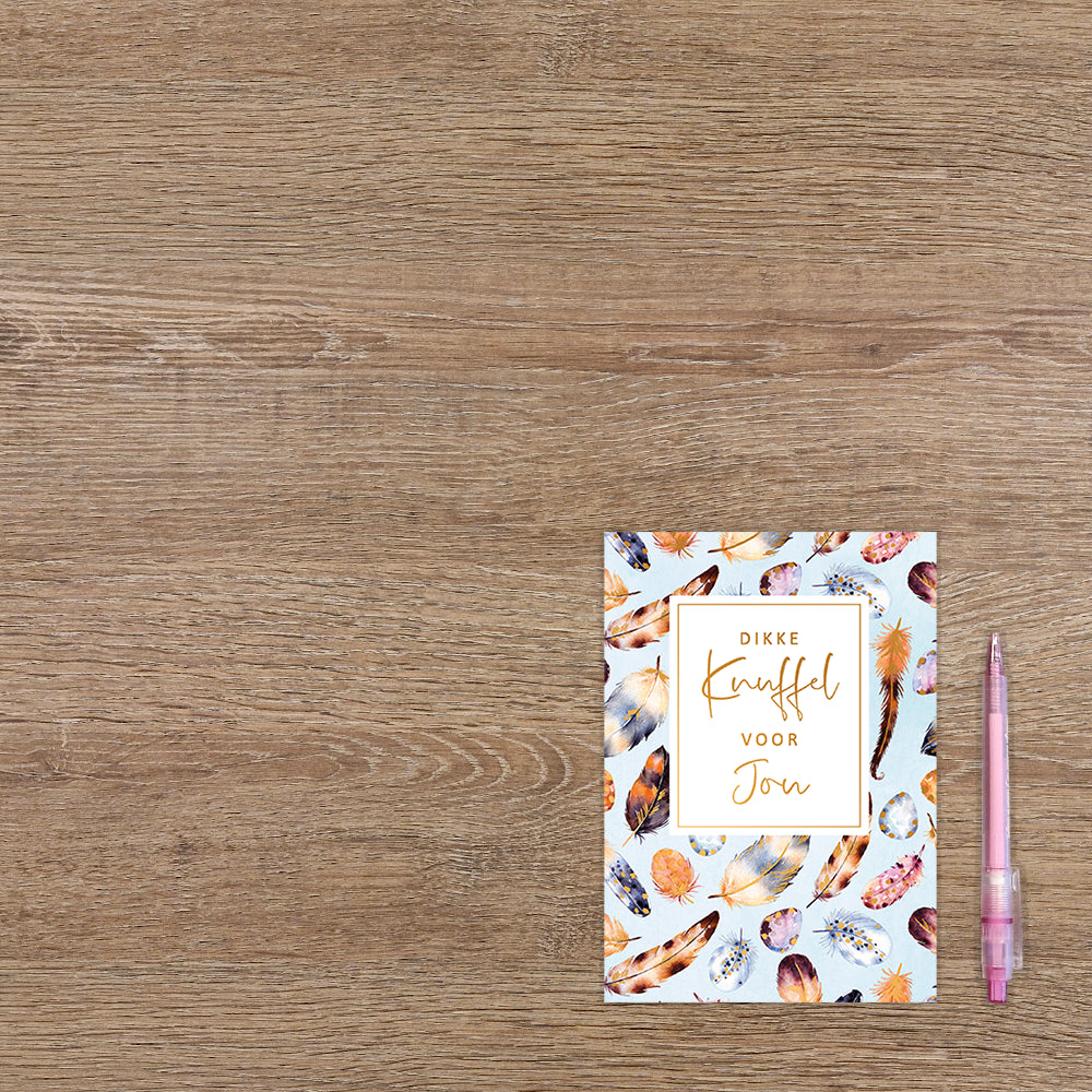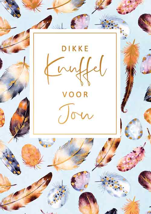 De wenskaart heeft een afmeting van x en een staande vorm. Op deze wenskaarten zij veren in de kleuren blauw, goud, zwart, wit, roze en oranje te zien, op een lichtblauwe achtergrond. In het midden zit een wit blok met de gouden tekst: "Dikke knuffel voor jou". De binnenzijde van de wenskaart is blanco wat voldoende ruimte geeft om een persoonlijke boodschap te schrijven .