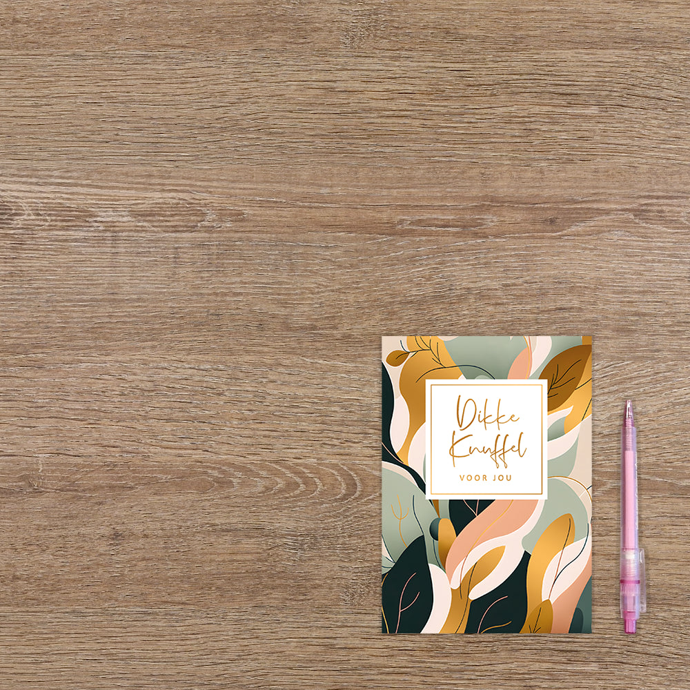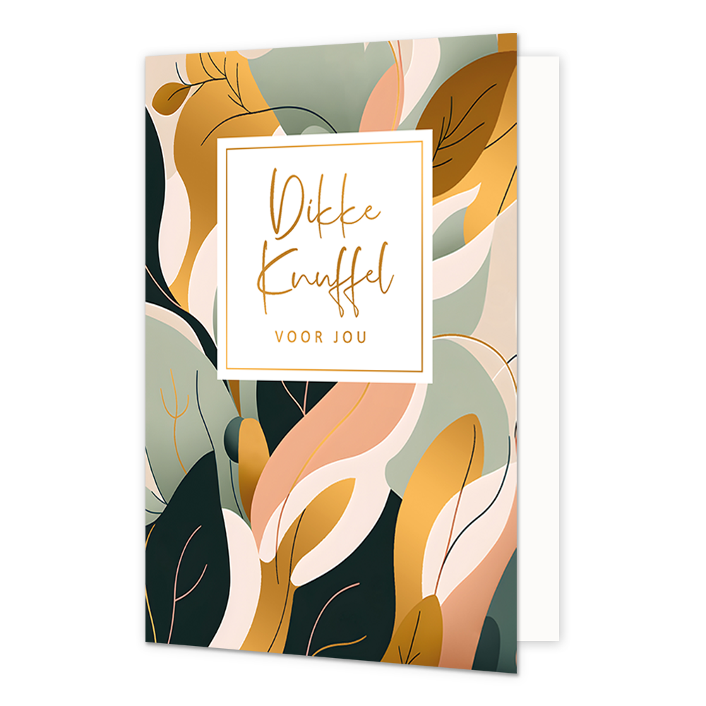 De wenskaart heeft een afmeting van x en een staande vorm. Op deze wenskaart zijn blaadjes te zien in de kleuren, goud, roze, groen, wit en zwart. In het midden zit een wit blok met de gouden tekst: "Dikke knuffel voor jou". De binnenzijde van de wenskaart is blanco wat voldoende ruimte geeft om een persoonlijke boodschap te schrijven .