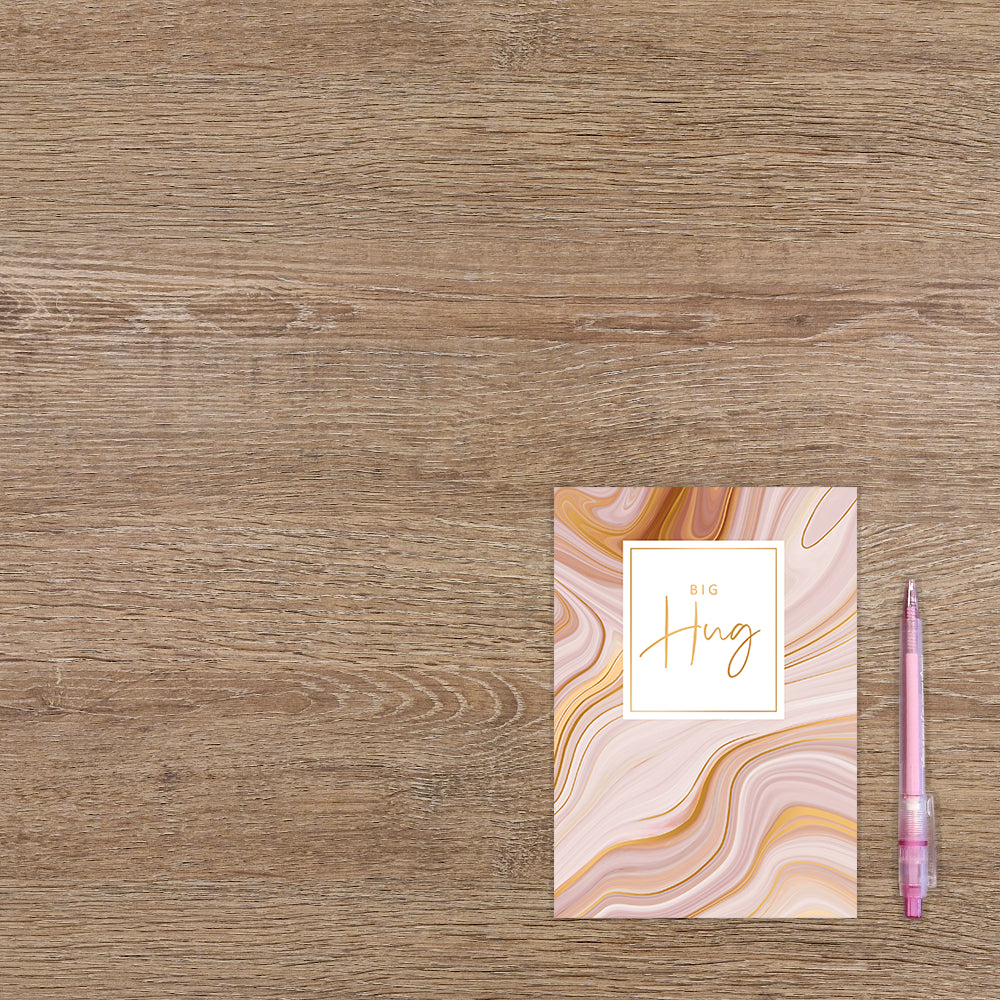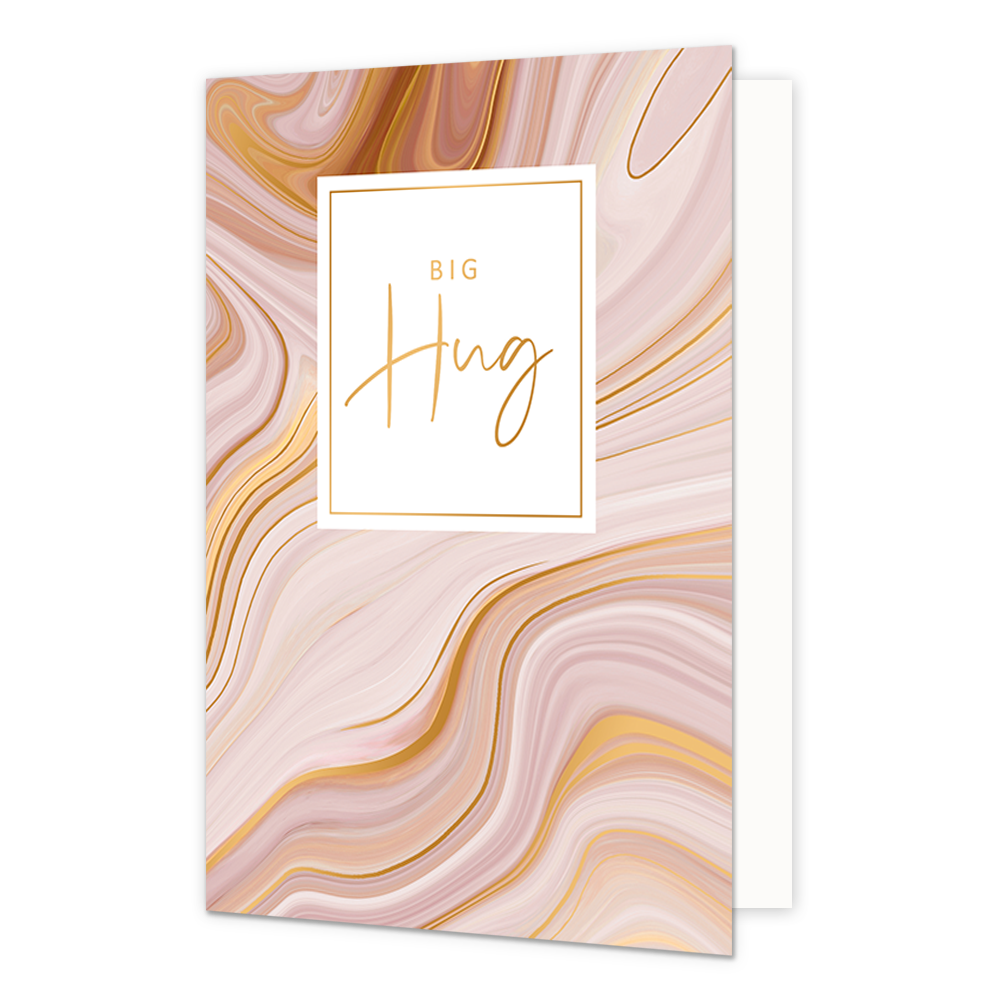De wenskaart heeft een afmeting van x en een staande vorm. Op deze artistieke wenskaart staat een ontwerp met de kleuren beige, bruin, roze en goud, met in het midden een wit vlak met de tekst: "Big hug". De binnenzijde van de wenskaart is blanco wat voldoende ruimte geeft om een persoonlijke boodschap te schrijven .