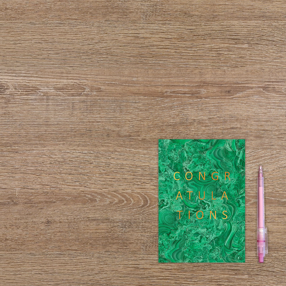 De wenskaart heeft een afmeting van x en een staande vorm. Op deze artistieke wenskaart zijn diverse vormen te zien in de kleur groen. In het midden staat de tekst: "Congratulations" in gouden letters. De binnenzijde van de wenskaart is blanco wat voldoende ruimte geeft om een persoonlijke boodschap te schrijven .