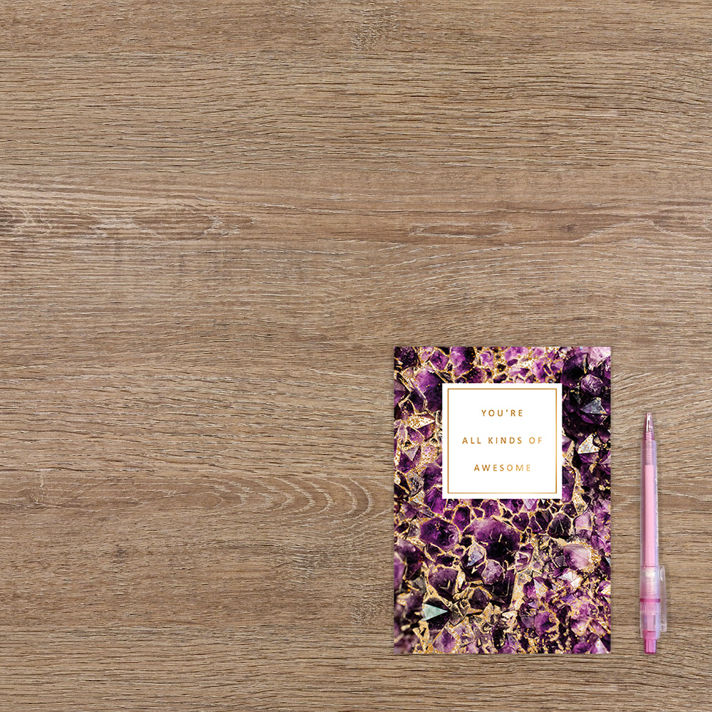 De wenskaart heeft een afmeting van x en een staande vorm. Op deze artistieke wenskaart is een ontwerp te zien in de kleuren paars en goud. In het midden zit een wit blok met de gouden tekst: "You're all kinds of awesome". De binnenzijde van de wenskaart is blanco wat voldoende ruimte geeft om een persoonlijke boodschap te schrijven .