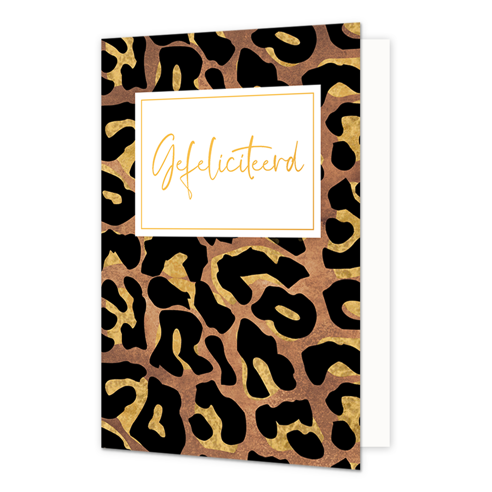 De wenskaart heeft een afmeting van x en een staande vorm. Op deze wenskaart is een ontwerp te zien geïnspireerd op de vlekken van een luipaard, met de kleuren zwart, bruin en goud. In het midden zit een wit blok met de gouden tekst: "Gefeliciteerd". De binnenzijde van de wenskaart is blanco wat voldoende ruimte geeft om een persoonlijke boodschap te schrijven .