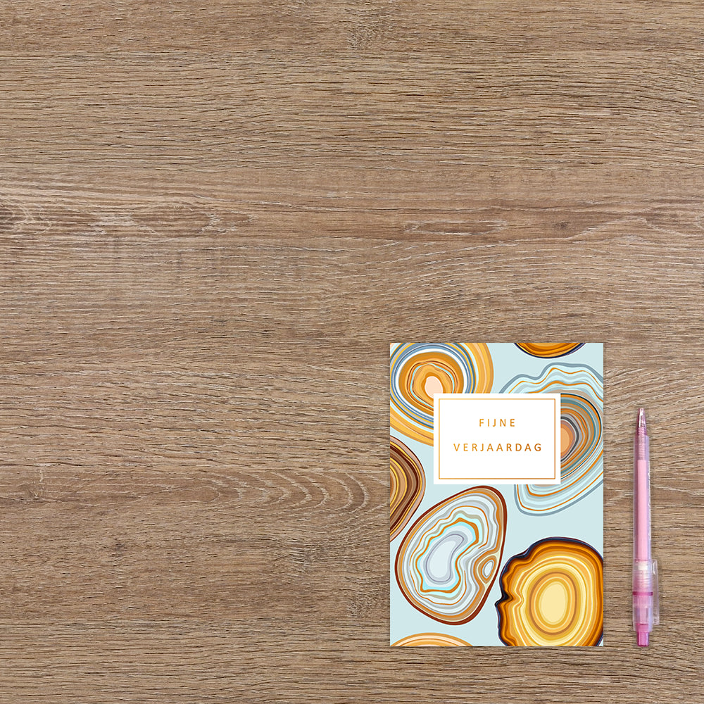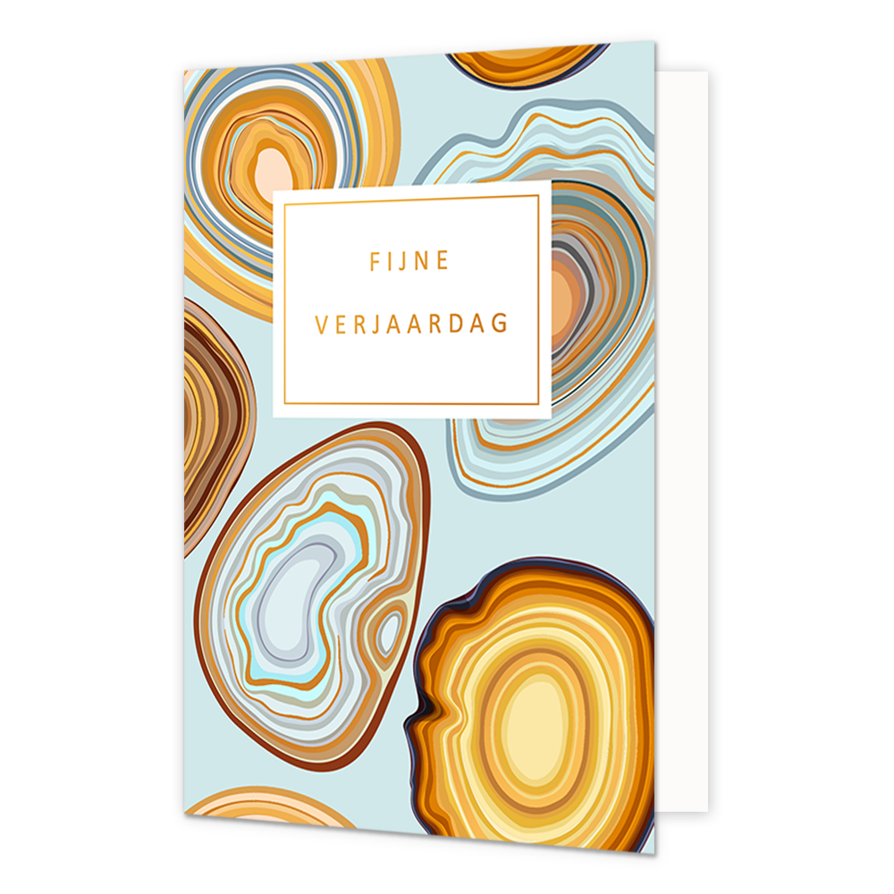 De wenskaart heeft een afmeting van x en een staande vorm. Op deze artistieke wenskaart is een ontwerp te zien met cirkels in de kleuren goud, blauw, lila, wit en geel, op een lichtblauwe achtergrond. In het midden zit een wit blok met de gouden tekst: "Fijne verjaardag". De binnenzijde van de wenskaart is blanco wat voldoende ruimte geeft om een persoonlijke boodschap te schrijven .