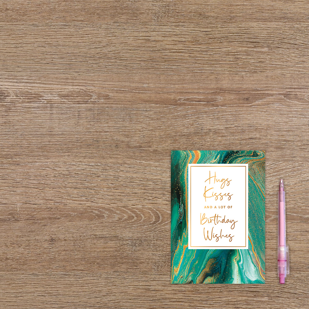 De wenskaart heeft een afmeting van x en een staande vorm. Op deze artistieke wenskaart staat een ontwerp met de kleuren groen, wit en goud. In het midden staan een wit vlak met de tekst: "Hugs kisses and a lot of birthday wishes". De binnenzijde van de wenskaart is blanco wat voldoende ruimte geeft om een persoonlijke boodschap te schrijven .