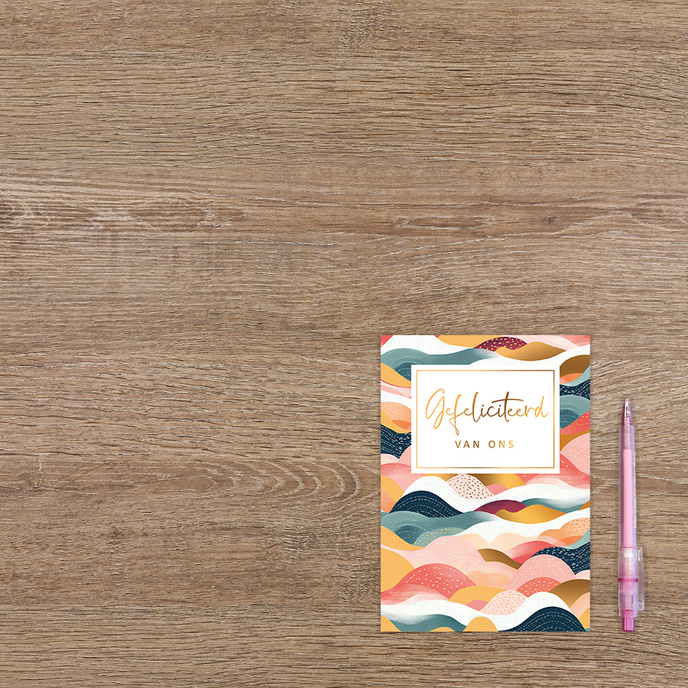 De wenskaart heeft een afmeting van x en een staande vorm. Op deze wenskaart is een ontwerp te zien geïnspireerd op wolken met de kleuren wit, blauw, roze, goud en rood. In het midden zit een wit blok met de gouden tekst: "Gefeliciteerd van ons". De binnenzijde van de wenskaart is blanco wat voldoende ruimte geeft om een persoonlijke boodschap te schrijven .