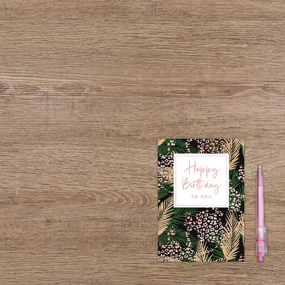 De wenskaart heeft een afmeting van x en een staande vorm. Op deze wenskaart zijn bladeren in groen en goud te zien met lichtroze vlekken die bloemen voorstellen. In het midden zit een wit blok met de gouden tekst: "Happy birthday to you". De binnenzijde van de wenskaart is blanco wat voldoende ruimte geeft om een persoonlijke boodschap te schrijven .