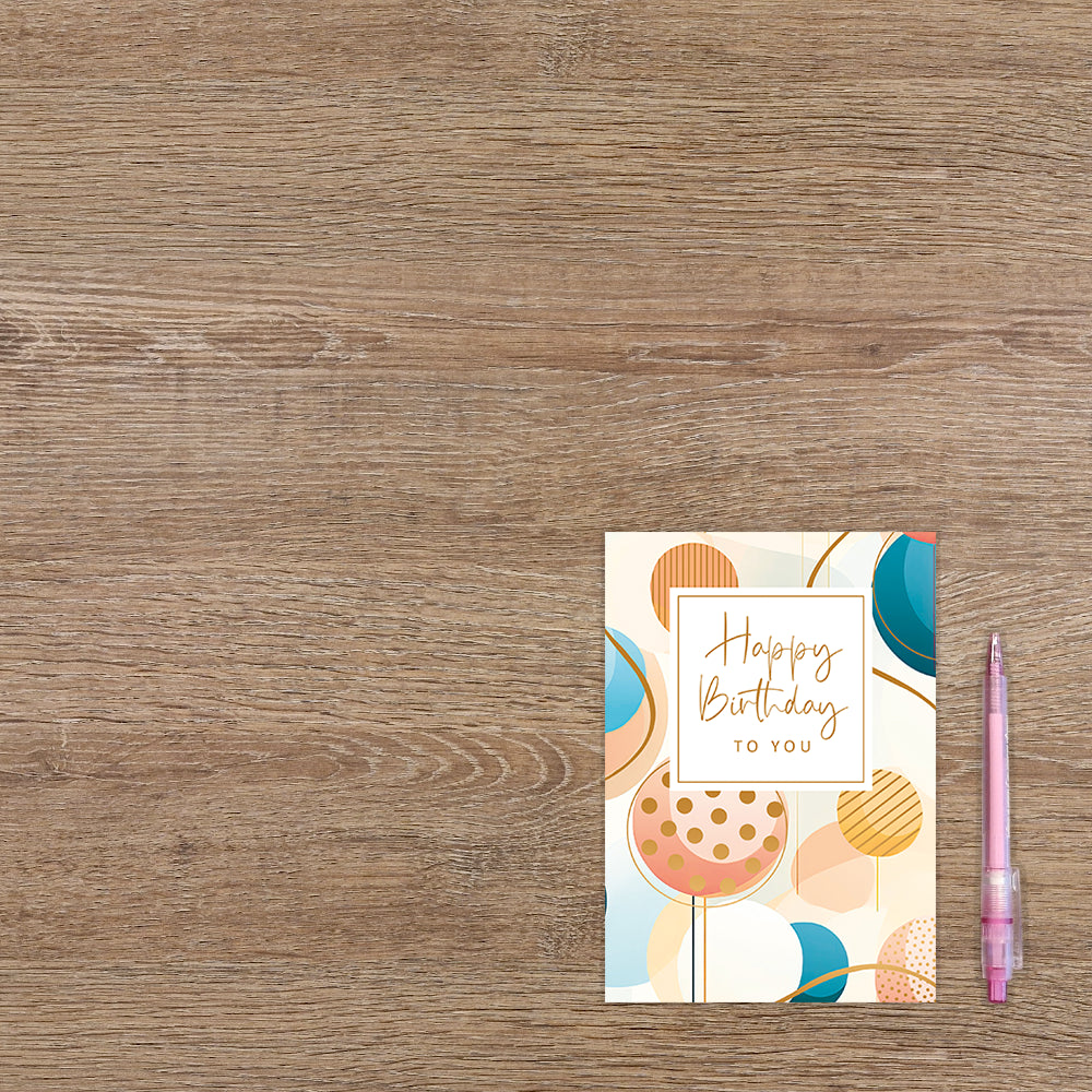 De wenskaart heeft een afmeting van x en een staande vorm. Op deze wenskaart zijn cirkels, lijnen en stippen te zien in de kleuren goud, blauw, roze en wit. In het midden zit een wit blok met de gouden tekst: "Happy birthday to you". De binnenzijde van de wenskaart is blanco wat voldoende ruimte geeft om een persoonlijke boodschap te schrijven .