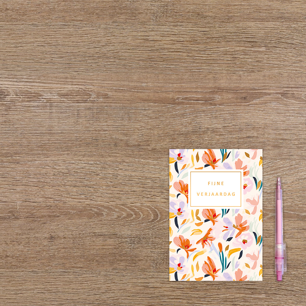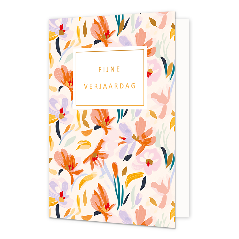 De wenskaart heeft een afmeting van x en een liggende vorm. Op deze wenskaart zijn bloemen te zien in de kleuren roze, lila, oranje en goud met mint en turquoise kleurige stengels. In het midden zit een wit blok met de gouden tekst: " De binnenzijde van de wenskaart is blanco wat voldoende ruimte geeft om een persoonlijke boodschap te schrijven .