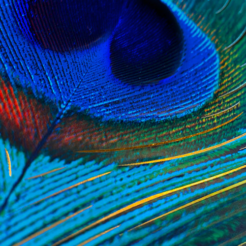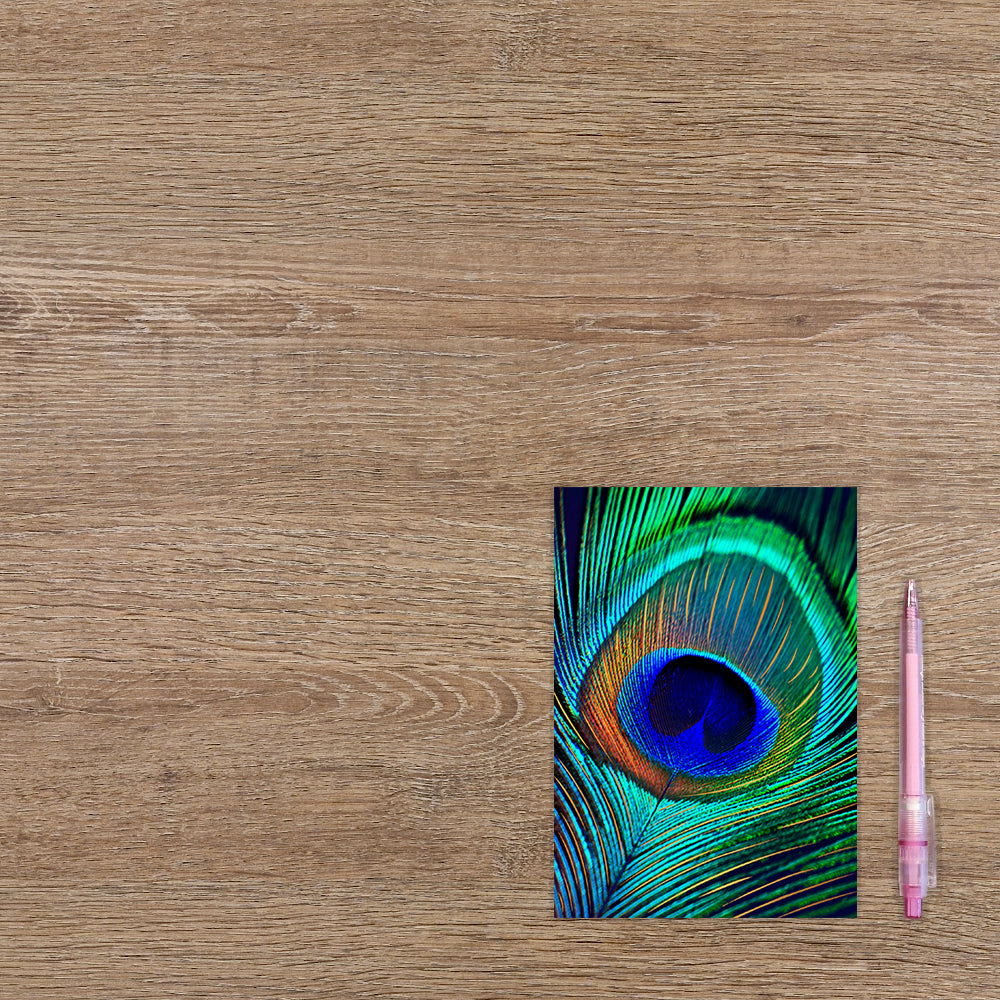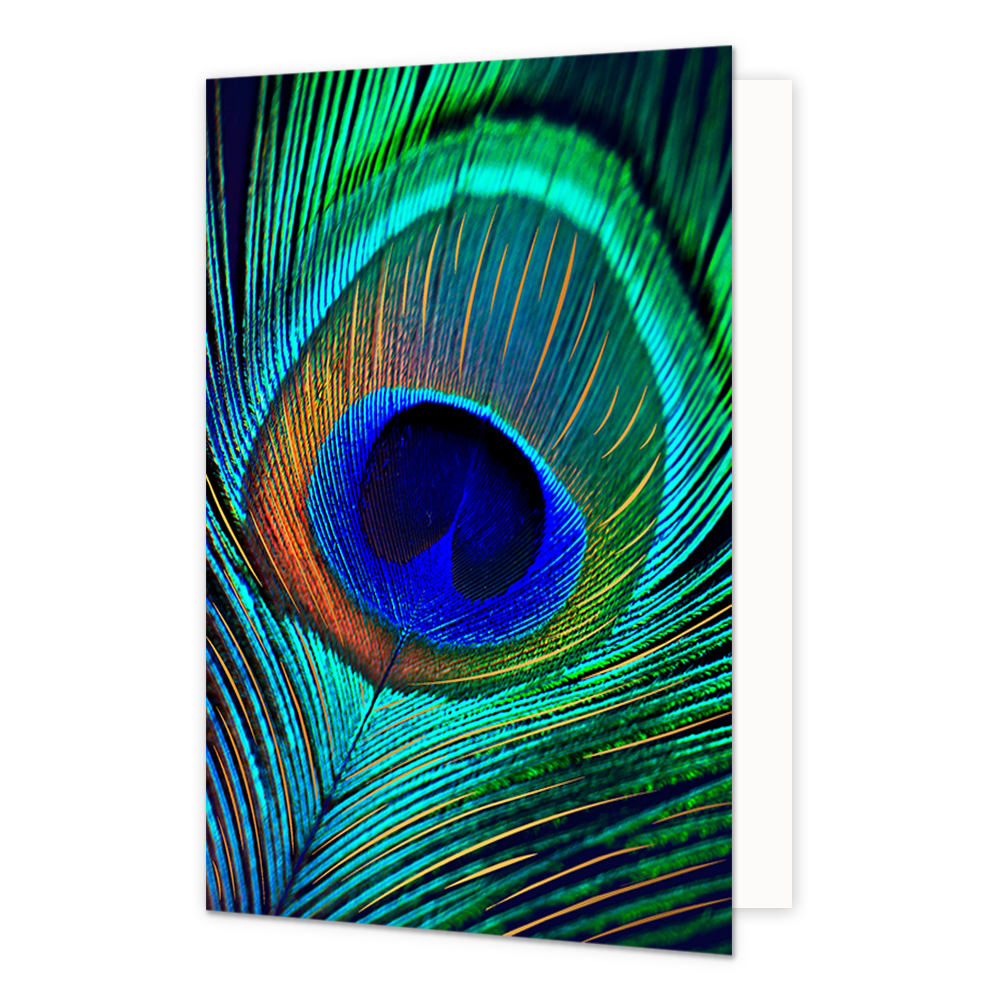 De wenskaart heeft een afmeting van x en een liggende vorm. Op deze wenskaart is een pauwenveer te zien in de kleuren blauw, turquoise, groen en goud. De binnenzijde van de wenskaart is blanco wat voldoende ruimte geeft om een persoonlijke boodschap te schrijven .