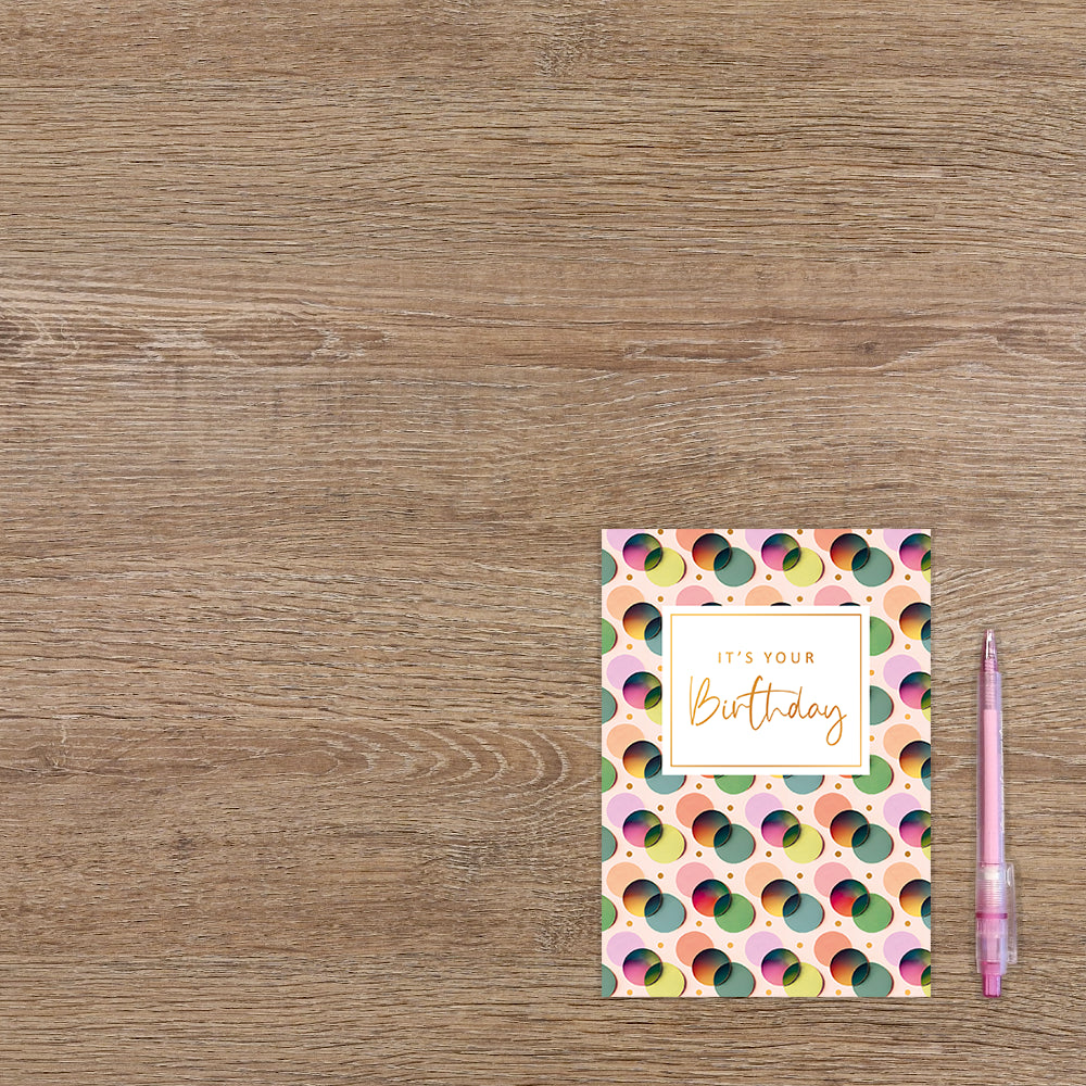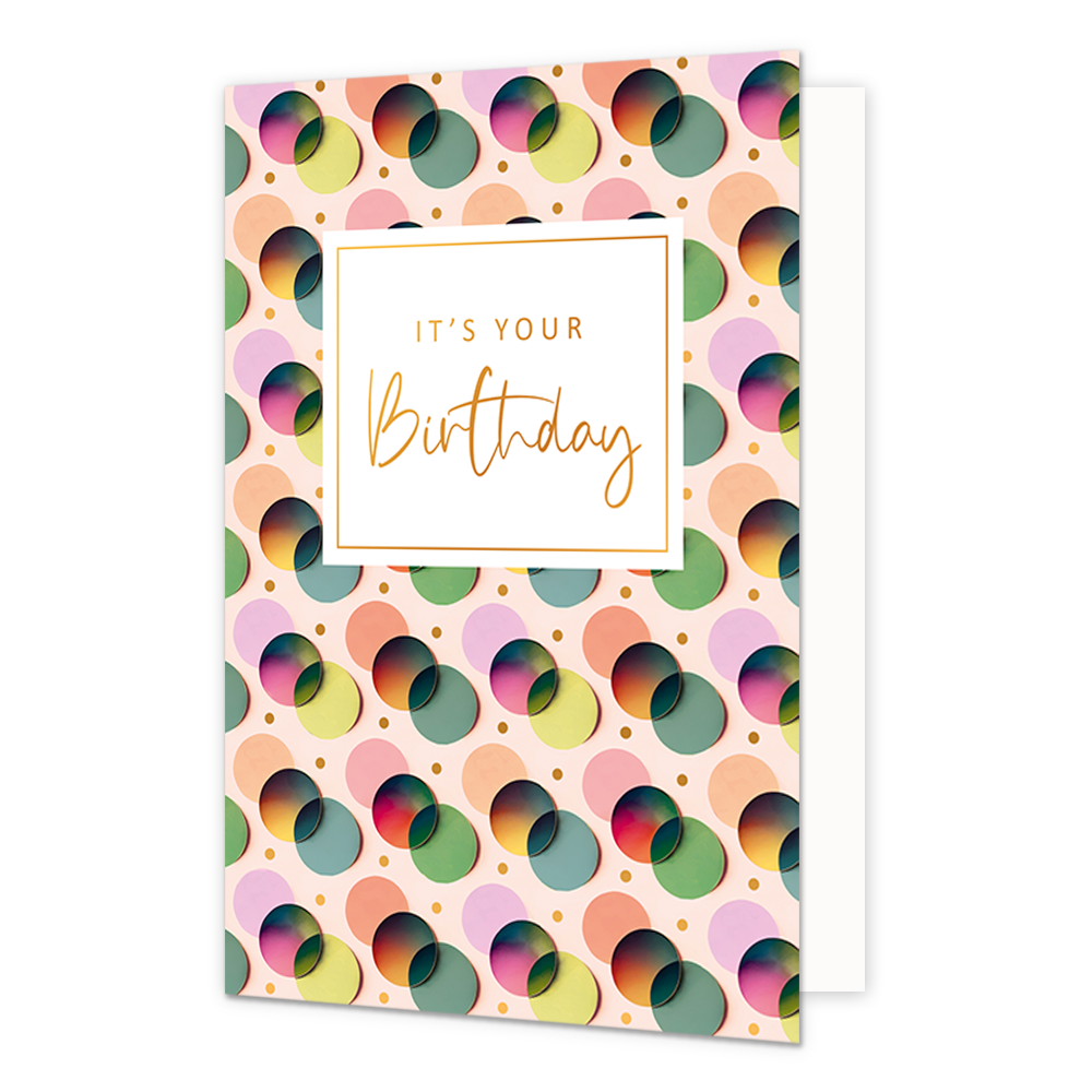De wenskaart heeft een afmeting van x en een liggende vorm. Op deze wenskaart zijn stippen te zien in de kleuren lila, orangje, groen, blauw en rood. In het midden zit een wit blok met de gouden tekst: "It's your birthday". De binnenzijde van de wenskaart is blanco wat voldoende ruimte geeft om een persoonlijke boodschap te schrijven .