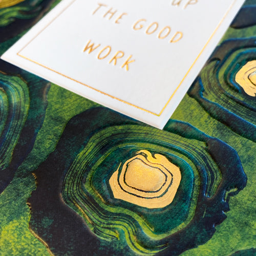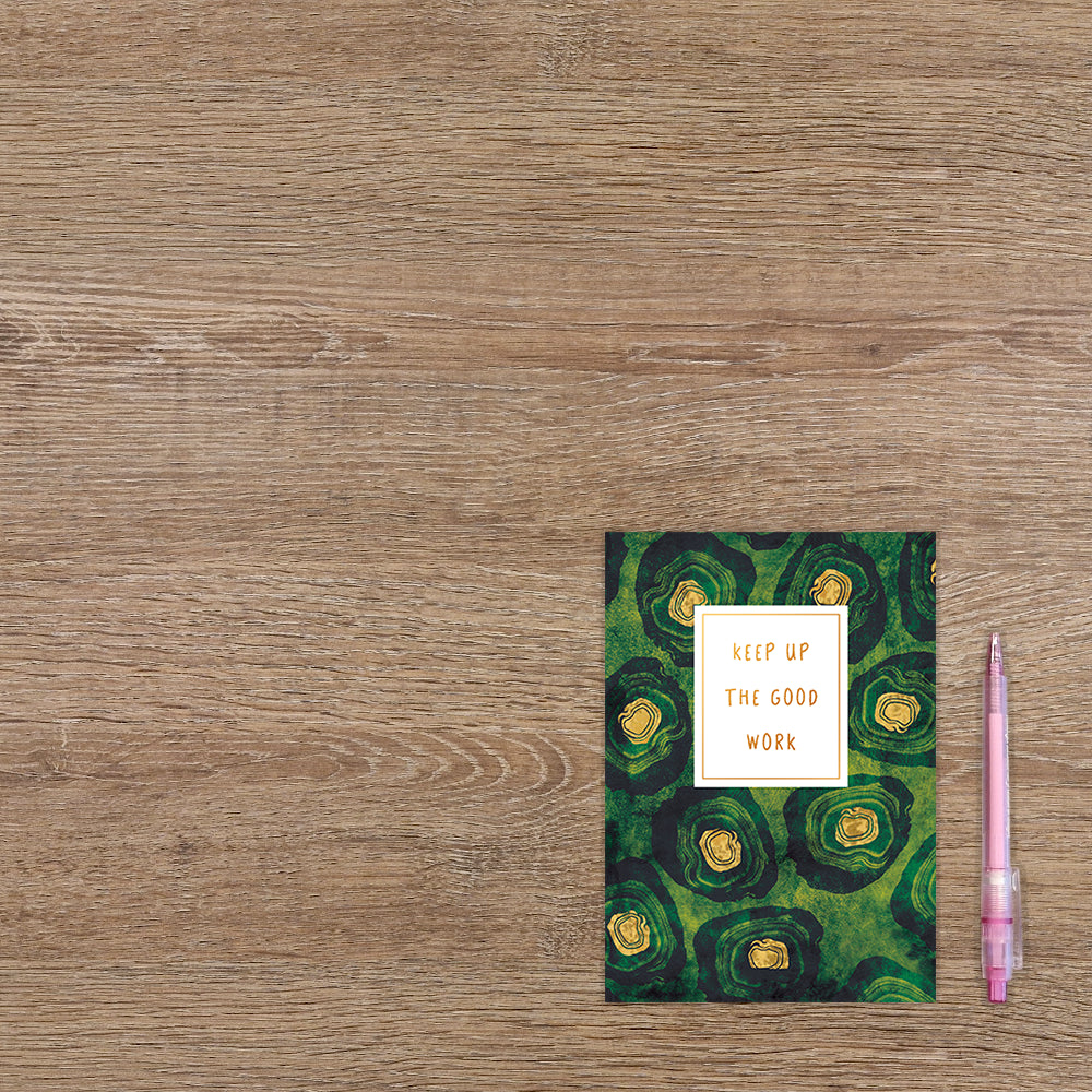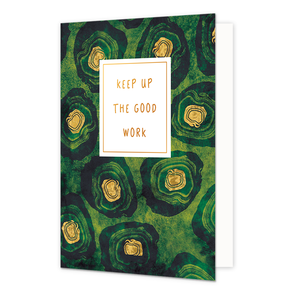 De wenskaart heeft een afmeting van x en een liggende vorm. Op deze artistieke wenskaart zijn groene en gouden cirkels te zien op een groene achtergrond. In het midden zit een wit blok met de gouden tekst: "Keep up the good work". De binnenzijde van de wenskaart is blanco wat voldoende ruimte geeft om een persoonlijke boodschap te schrijven .