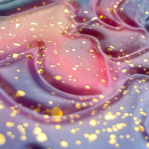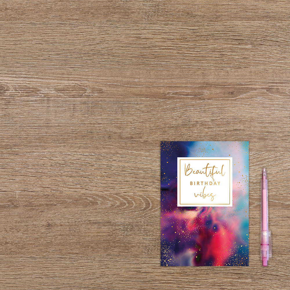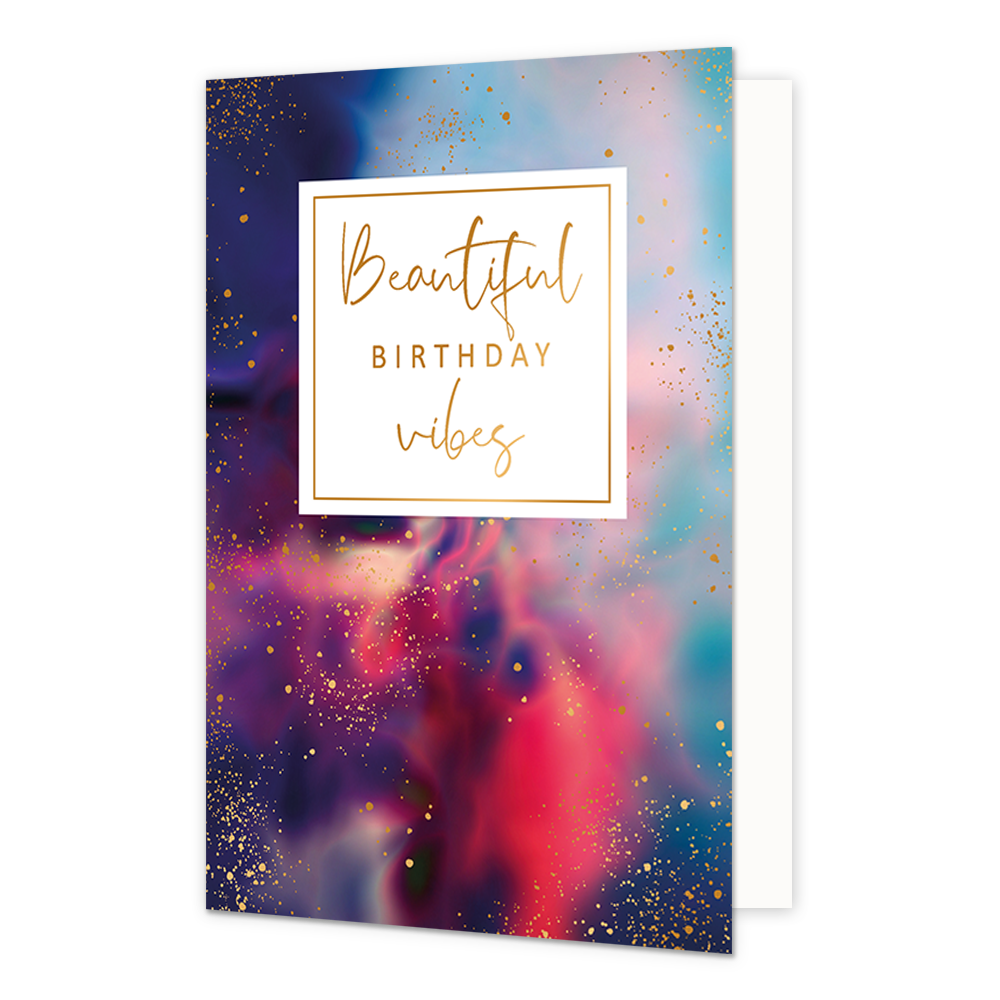 De wenskaart heeft een afmeting van x en een liggende vorm. Op deze artistieke wenskaart is een ontwerp te zien met de kleuren blauw, roze, rood en goud. In het midden zit een wit blok met de gouden tekst: "Beautiful birthday vibes". De binnenzijde van de wenskaart is blanco wat voldoende ruimte geeft om een persoonlijke boodschap te schrijven .
