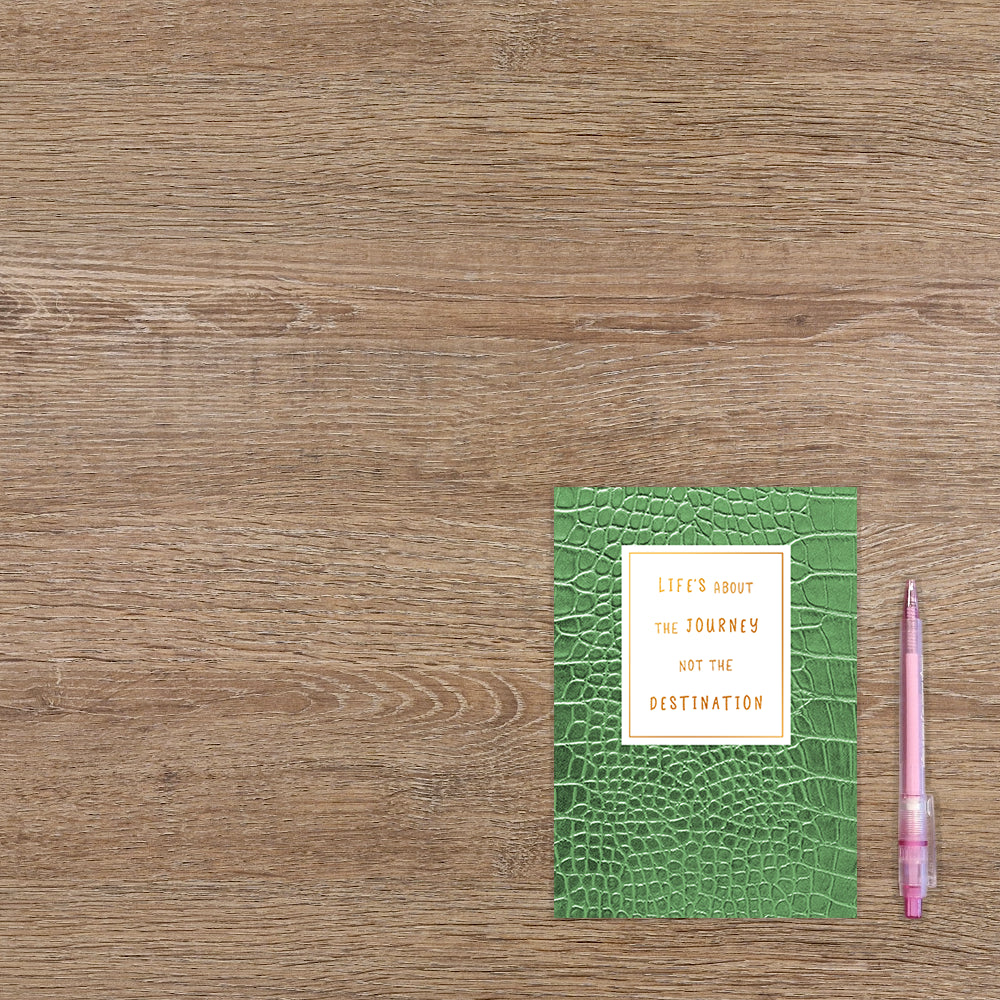 De wenskaart heeft een afmeting van x en een liggende vorm. Op deze wenskaart is een ontwerp te zien dat lijkt op een reptielenhuid in de kleur groen. In het midden zit een wit blok met de gouden tekst: "Life's about the journey not the destination". De binnenzijde van de wenskaart is blanco wat voldoende ruimte geeft om een persoonlijke boodschap te schrijven .