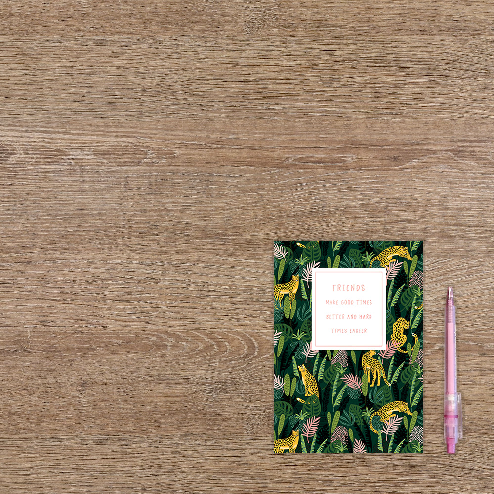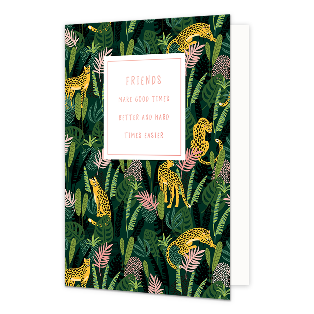 De wenskaart heeft een afmeting van x en een staande vorm. Op deze wenskaart zijn groene en roze bladeren te zien met gouden luipaarden. In het midden zit een wit blak met de gouden tekst: "FRIENDS make good times better and hard times easier". De binnenzijde van de wenskaart is blanco wat voldoende ruimte geeft om een persoonlijke boodschap te schrijven .