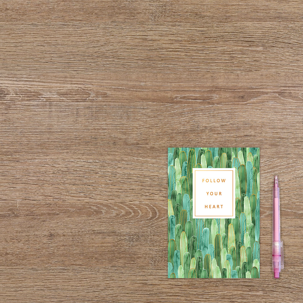 De wenskaart heeft een afmeting van x en een liggende vorm. Op deze wenskaart zijn langwerpige cactussen te zien in diverse kleuren groen, met een gouden omlijning. In het midden zit een wit blok met de gouden tekst: "Follow your heart". De binnenzijde van de wenskaart is blanco wat voldoende ruimte geeft om een persoonlijke boodschap te schrijven .