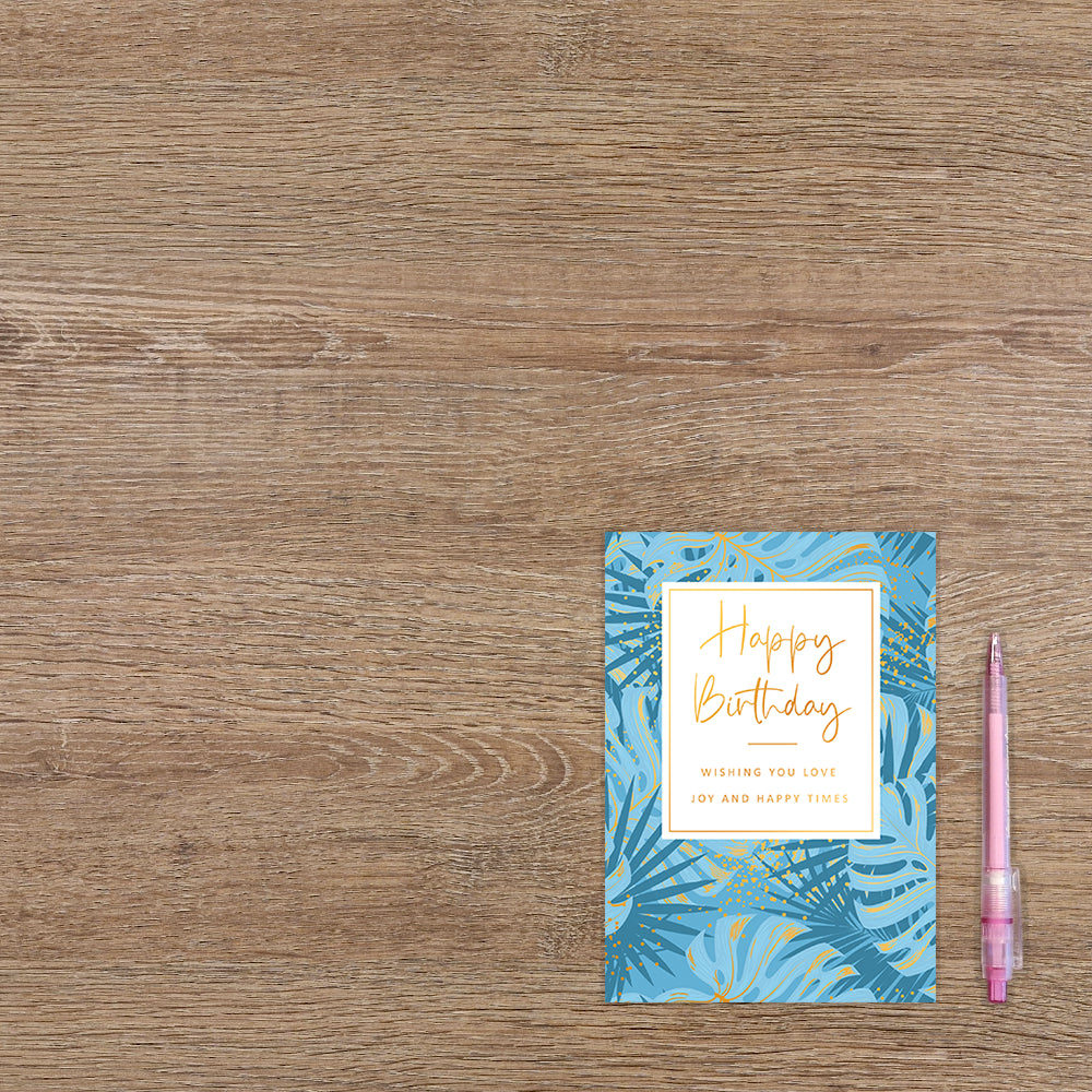 De wenskaart heeft een afmeting van x en een liggende vorm. Op deze wenskaart zijn blauwe bladeren met gouden details zichtbaar. In het midden zit een wit blok met de gouden tekst: "Happy birthday wishing you love joy and happy times". De binnenzijde van de wenskaart is blanco wat voldoende ruimte geeft om een persoonlijke boodschap te schrijven .