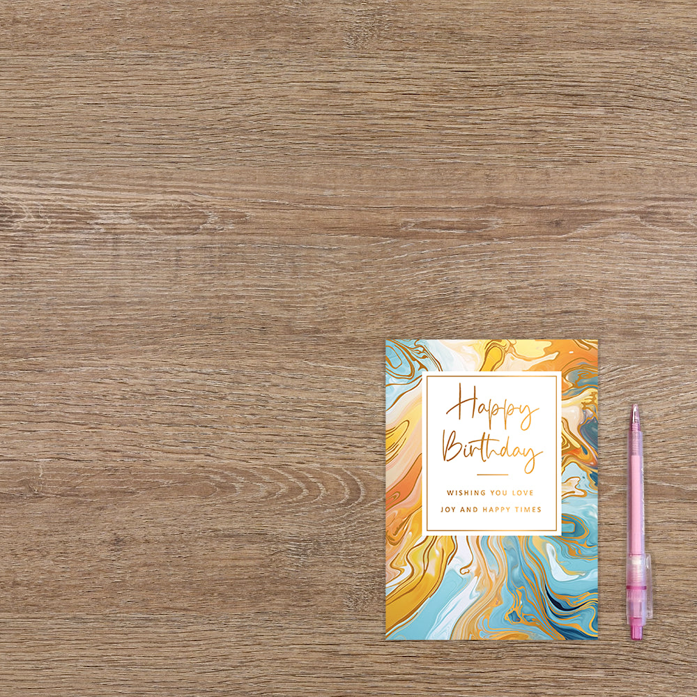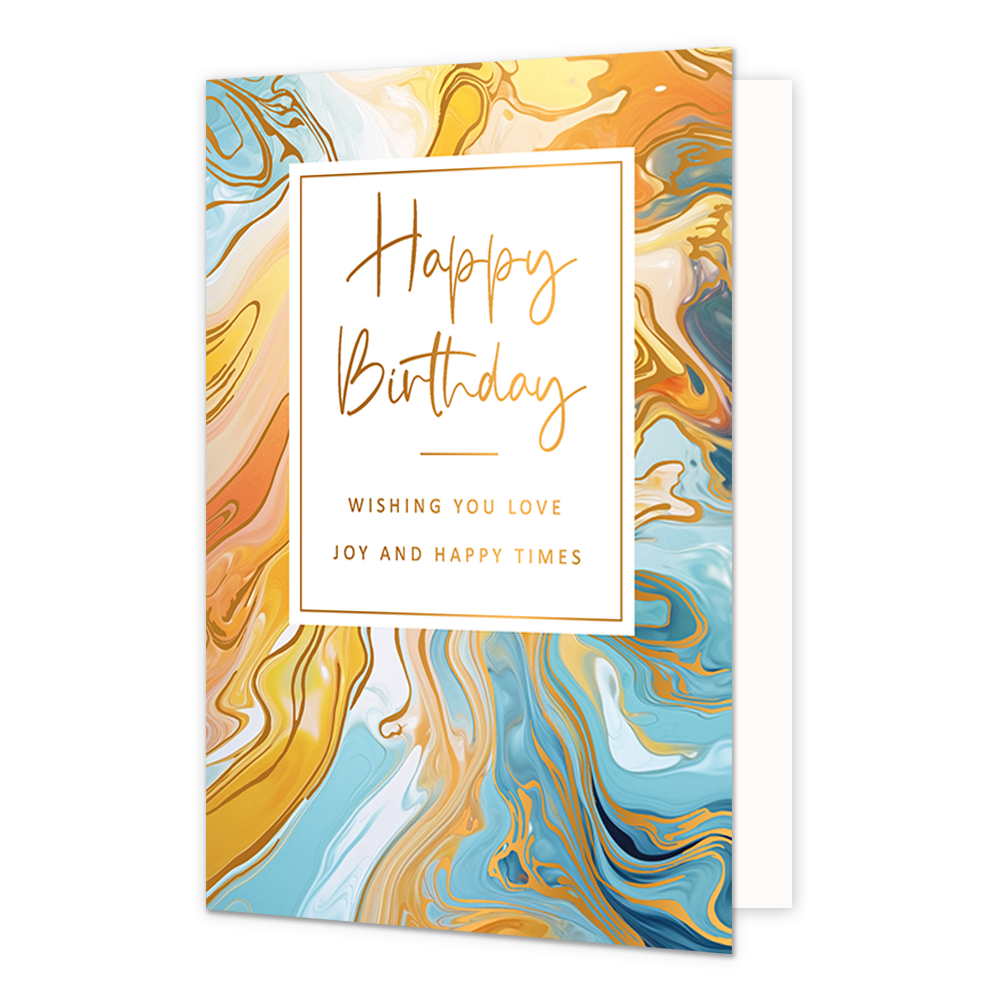 De wenskaart heeft een afmeting van x en een staande vorm. Op deze artistieke wenskaart staat een ontwerp met de kleuren blauw, oranje, geel, beige, wit en goud. De binnenzijde van de wenskaart is blanco wat voldoende ruimte geeft om een persoonlijke boodschap te schrijven .