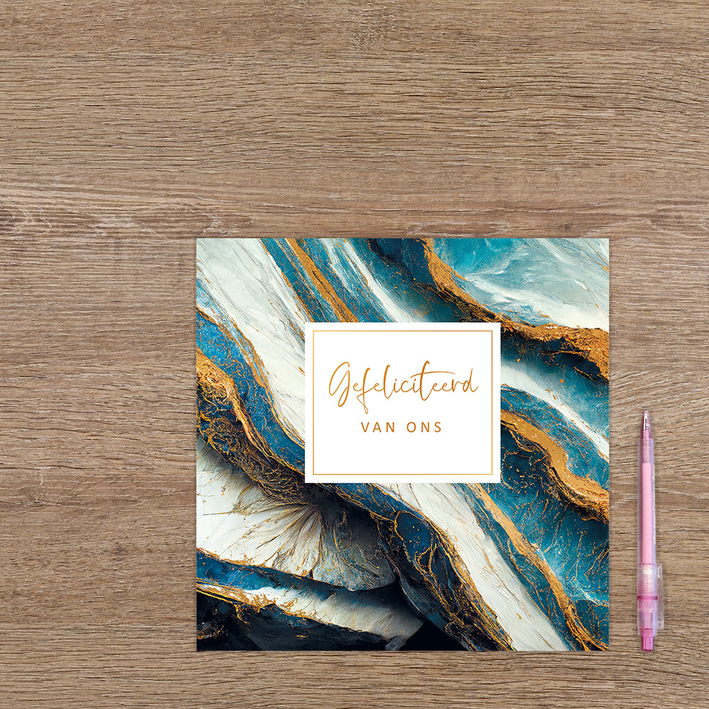 De wenskaart heeft een afmeting van x en een vierkante vorm. Op deze artistieke wenskaart is een ontwerp te zien in de kleuren goud, wit en diverse kleuren blauw. In het midden zit een wit blok met de gouden tekst: "Gefeliciteerd van ons". De binnenzijde van de wenskaart is blanco wat voldoende ruimte geeft om een persoonlijke boodschap te schrijven .
