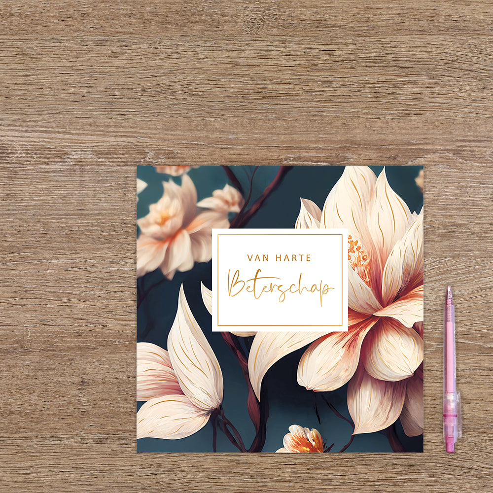 De wenskaart heeft een afmeting van x en een vierkante vorm. Op deze wenskaart zijn lichtroze bloemen te zien op een donkergroen/blauwe achtergrond. In het midden zit een wit blok met de gouden tekst: "Van harte beterschap". De binnenzijde van de wenskaart is blanco wat voldoende ruimte geeft om een persoonlijke boodschap te schrijven .
