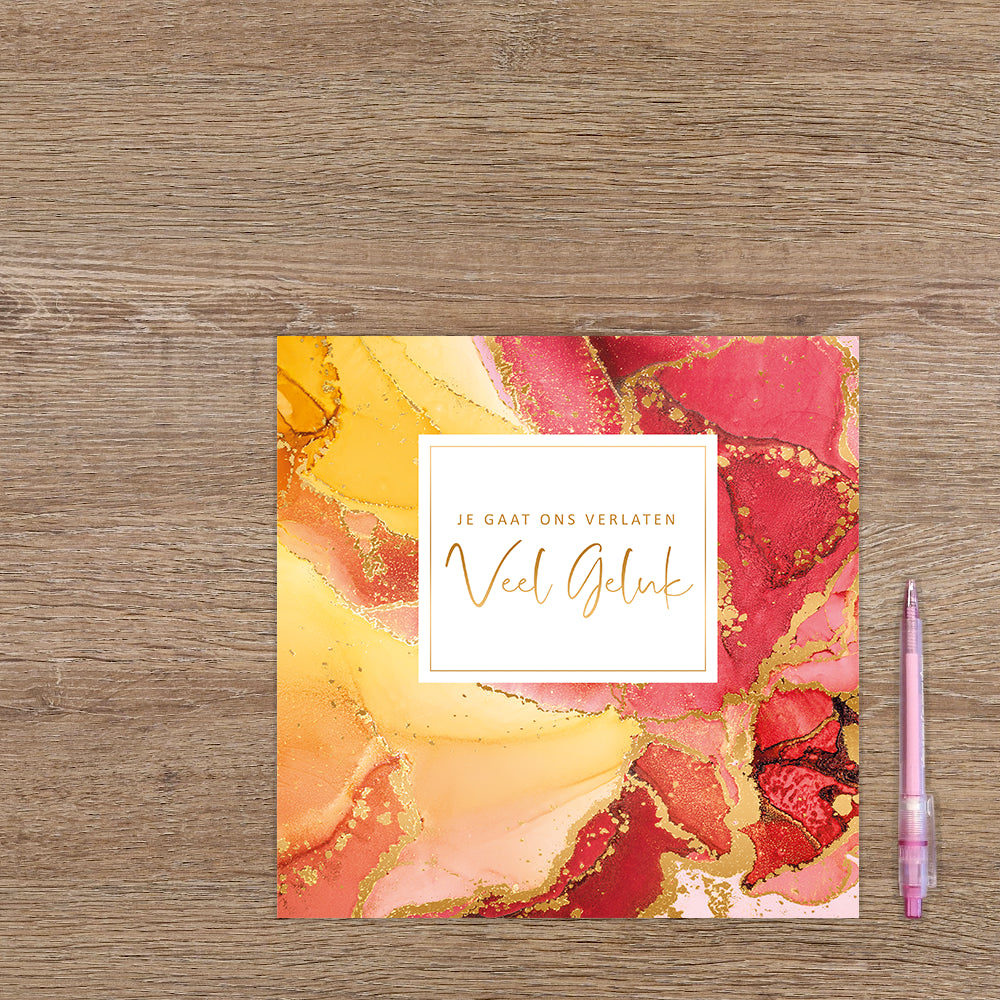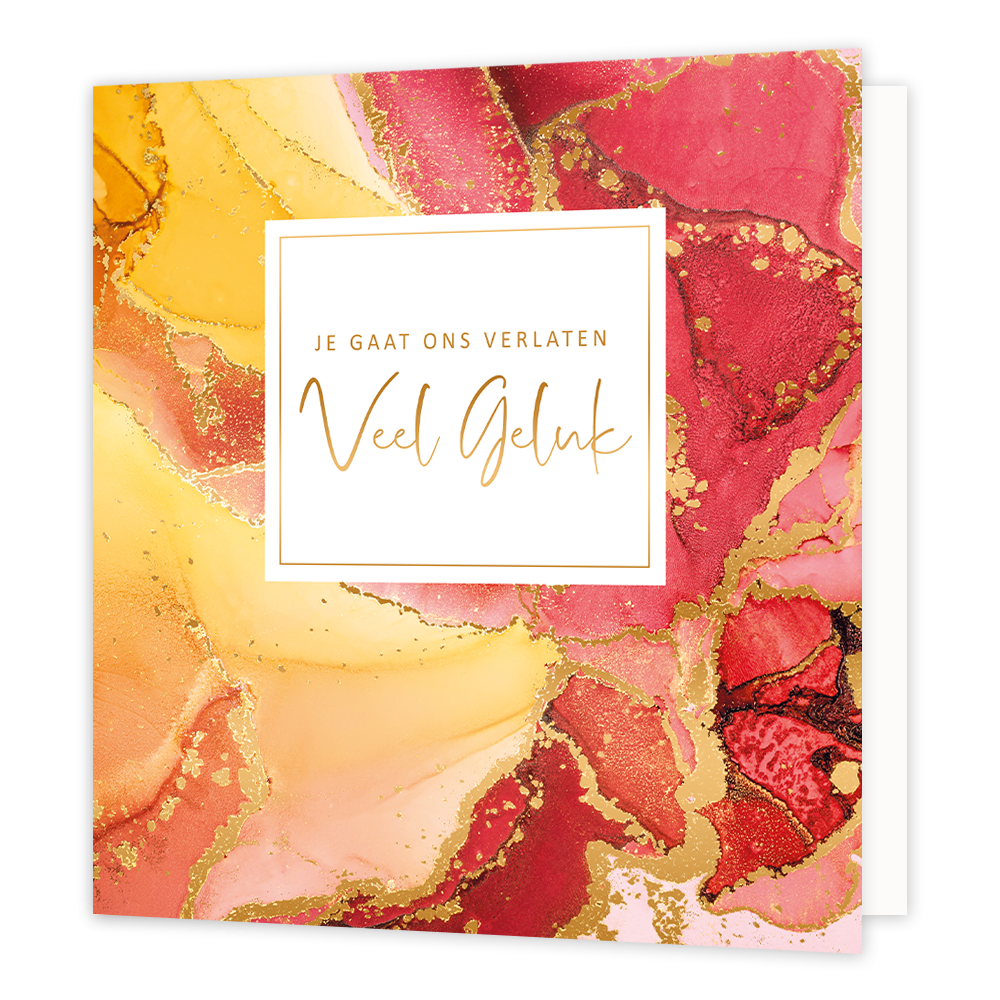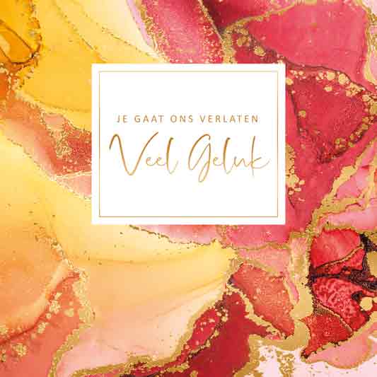 De wenskaart heeft een afmeting van x en een vierkante vorm. Op deze artistieke wenskaart is een ontwerp zichtbaar met de kleuren rood, roze, geel en goud. In het midden zit een wit blok met de gouden tekst: "Je gaat ons verlaten veel geluk". De binnenzijde van de wenskaart is blanco wat voldoende ruimte geeft om een persoonlijke boodschap te schrijven .
