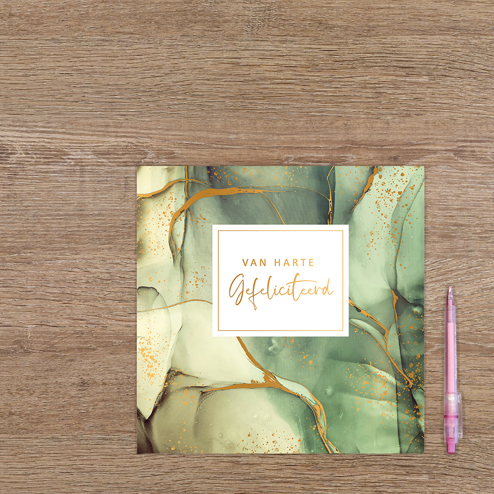 De wenskaart heeft een afmeting van x en een vierkante vorm. Op deze artistieke wenskaart is een ontwerp te zien met groene kleuren met gouden details. In het midden zit een wit blok met de tekst: "Van harte gefeliciteerd". De binnenzijde van de wenskaart is blanco wat voldoende ruimte geeft om een persoonlijke boodschap te schrijven .