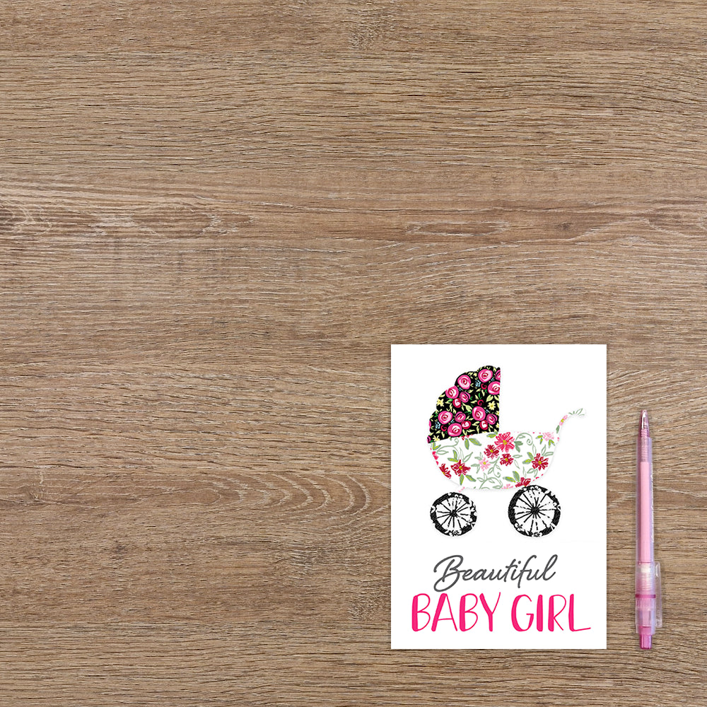 De wenskaart heeft een afmeting van x en een staande vorm. Op deze wenskaart staat een kinderwagen met daaronder de tekst: "Beautiful baby girl". De binnenzijde van de wenskaart is blanco wat voldoende ruimte geeft om een persoonlijke boodschap te schrijven .