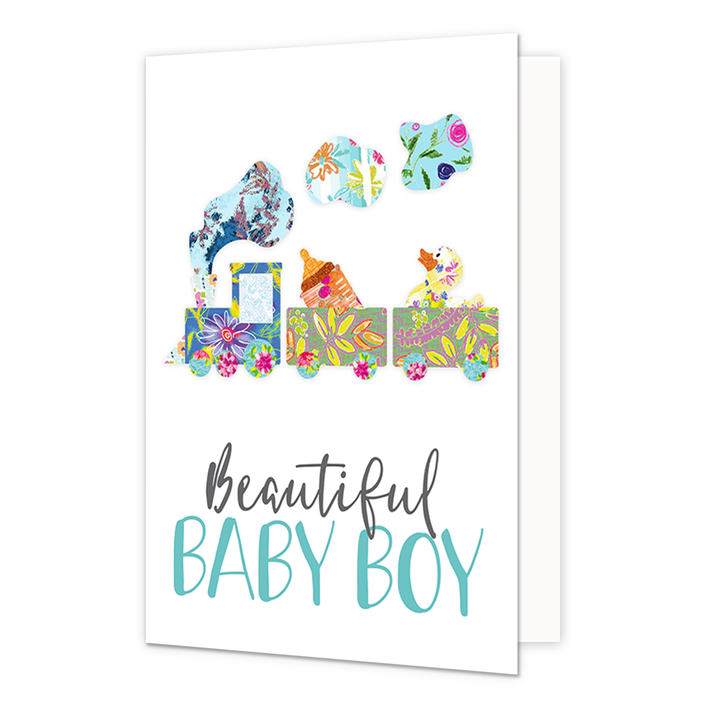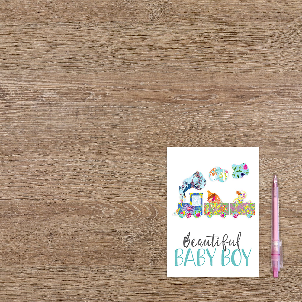 De wenskaart heeft een afmeting van x en een staande vorm. Op deze wenskaart staat een speelgoed trein met daaronder de tekst: "Beautiful baby boy". De binnenzijde van de wenskaart is blanco wat voldoende ruimte geeft om een persoonlijke boodschap te schrijven .