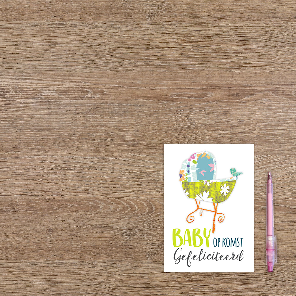 De wenskaart heeft een afmeting van x en een staande vorm. Op deze wenskaart staat een babywiegje met daaronder de tekst: "Baby op komst gefeliciteerd". De binnenzijde van de wenskaart is blanco wat voldoende ruimte geeft om een persoonlijke boodschap te schrijven .