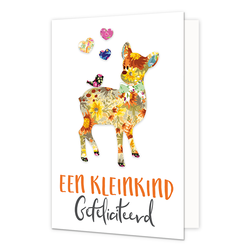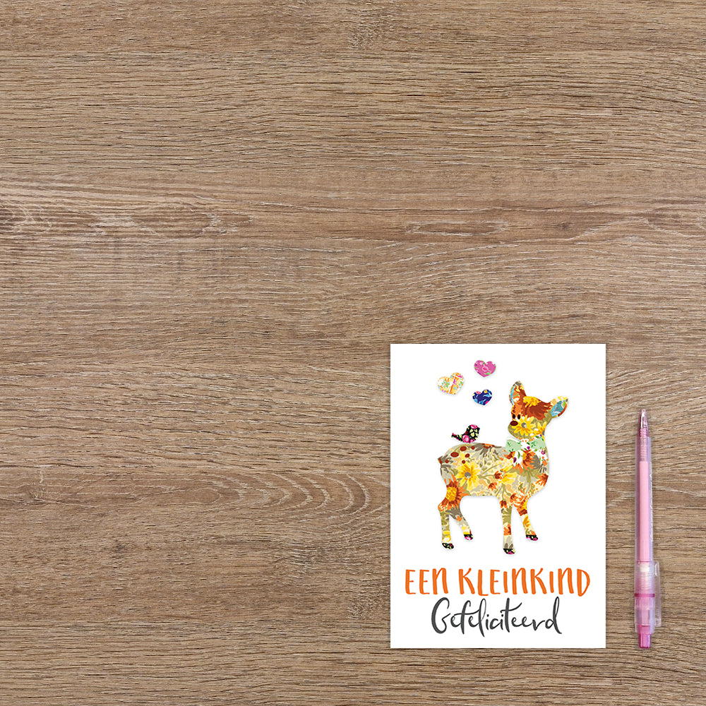 De wenskaart heeft een afmeting van x en een staande vorm. Op deze wenskaart staat een hartje en een vogeltje met daaronder de tekst: "Een kleinkind gefeliciteerd". De binnenzijde van de wenskaart is blanco wat voldoende ruimte geeft om een persoonlijke boodschap te schrijven .